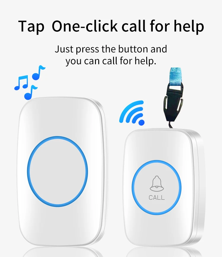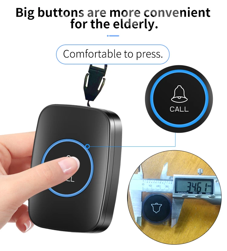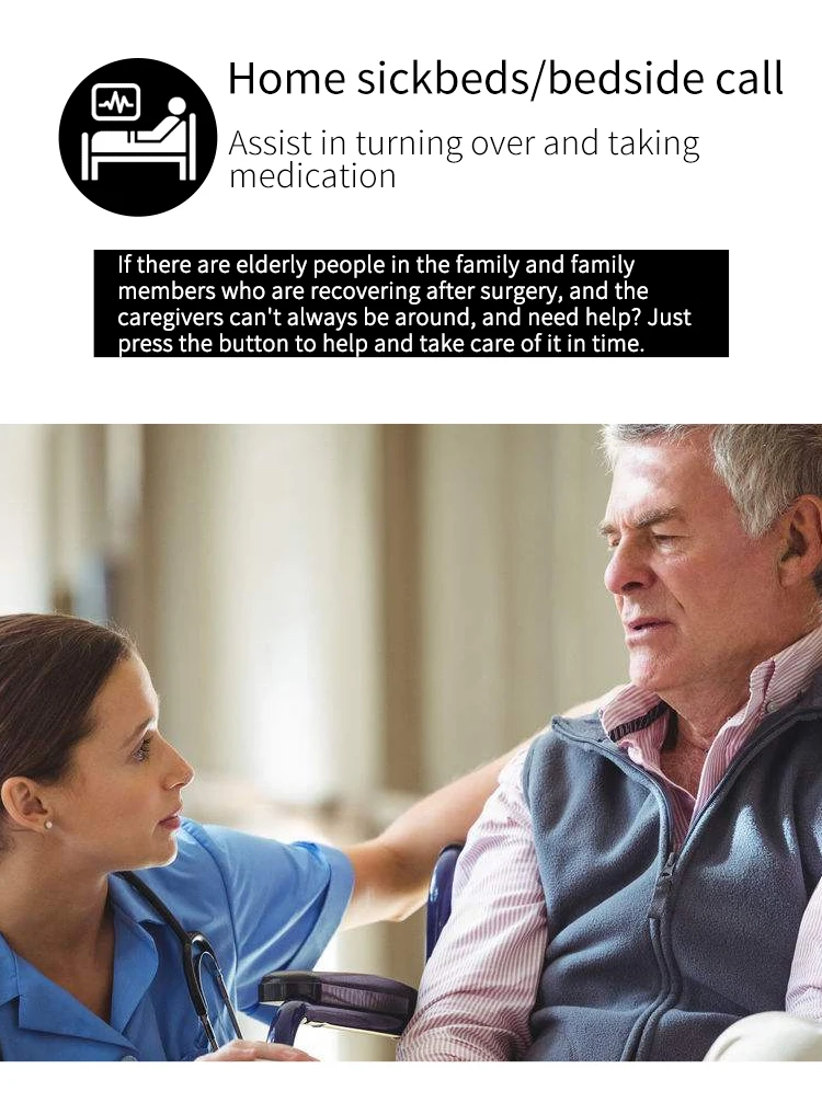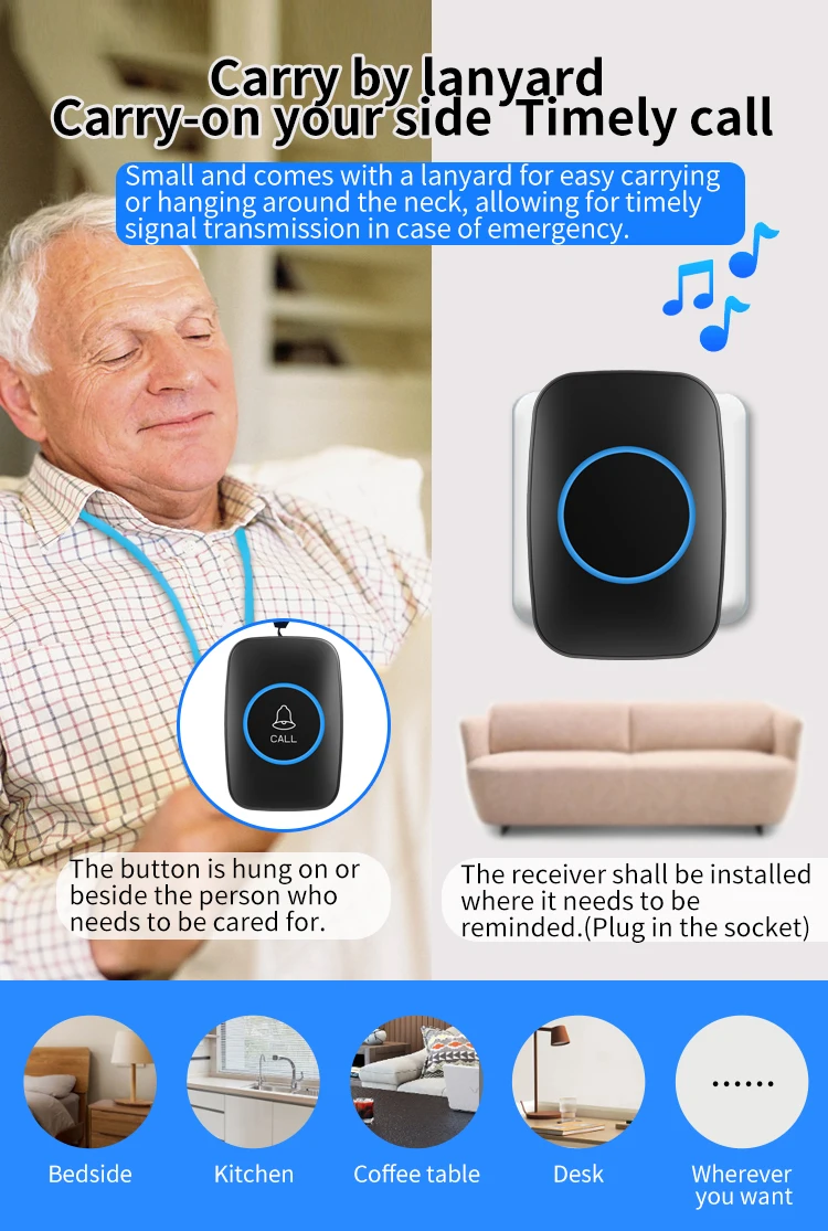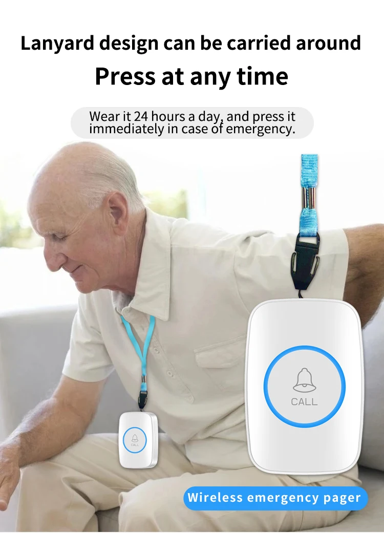 Le bouton d'alerte de vie est léger et portable, avec une lanière qui peut être accrochée autour du cou ou mise dans la poche et la taille ; il est étanche, peut être utilisé dans la salle de bain (ne le portez pas sous la douche et ne le trempez pas dans l'eau). Le téléavertisseur sans fil pour soignant comprend 1 récepteur et 1 bouton d'appel SOS, qui convient aux patients paralysés/handicapés/personnes âgées/patients en chute accidentelle/soins dans un lit d'hôpital/femmes enceintes, etc.