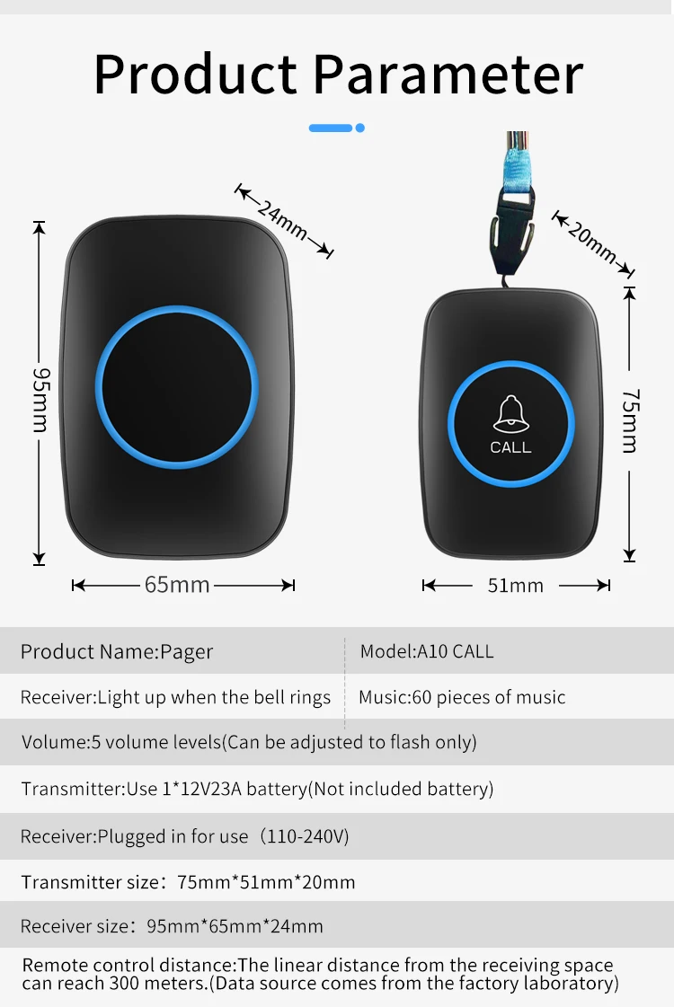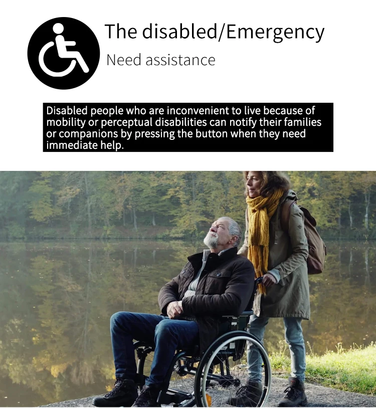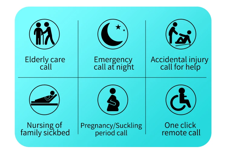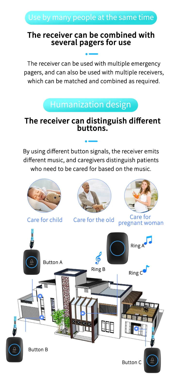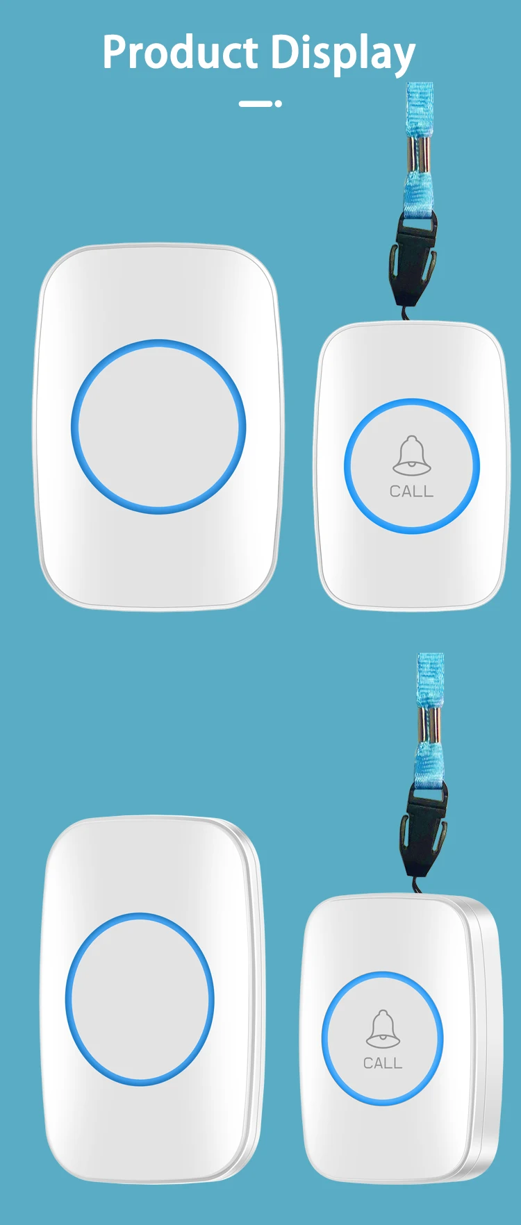 Le bouton d'alerte de vie est léger et portable, avec une lanière qui peut être accrochée autour du cou ou mise dans la poche et la taille ; il est étanche, peut être utilisé dans la salle de bain (ne le portez pas sous la douche et ne le trempez pas dans l'eau). Le téléavertisseur sans fil pour soignant comprend 1 récepteur et 1 bouton d'appel SOS, qui convient aux patients paralysés/handicapés/personnes âgées/patients en chute accidentelle/soins dans un lit d'hôpital/femmes enceintes, etc.