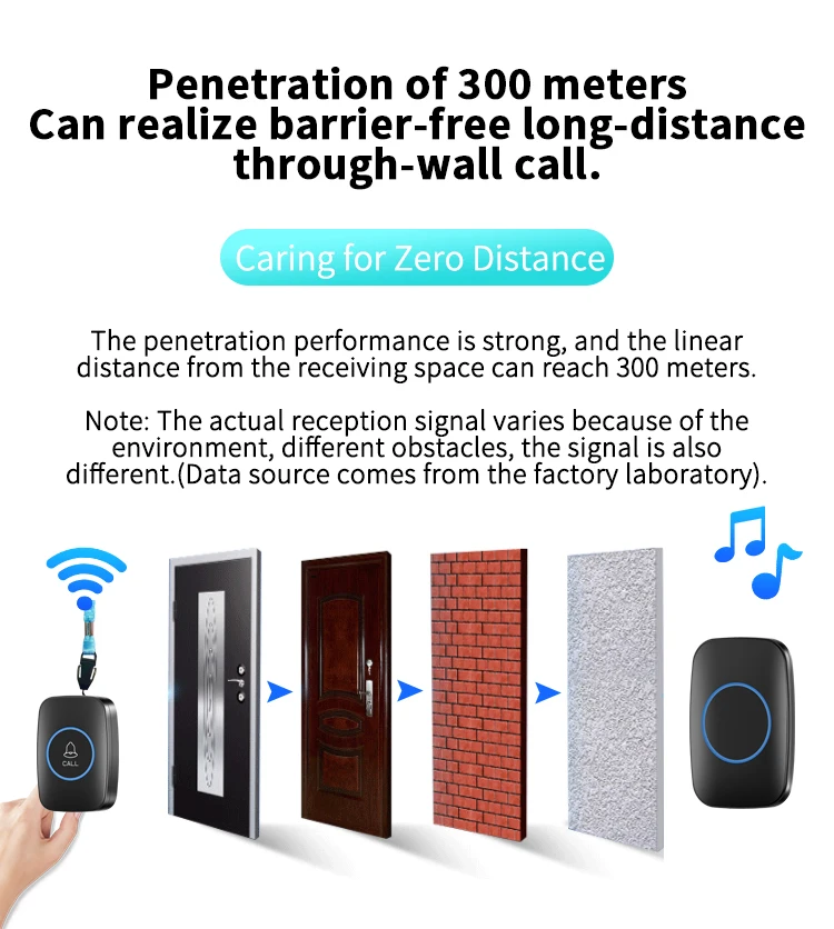 La portée d'alarme du récepteur et du bouton d'appel d'urgence dans la zone ouverte est de 300 m (étant donné que le signal du récepteur du téléavertisseur d'alerte de vie d'urgence sera perturbé par les murs ou le métal, veuillez le placer à côté de l'émetteur pour éviter d'affecter l'utilisation normale).
