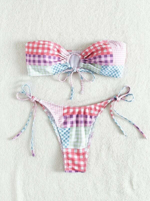 Women's hot spring resort plaid lace-up small fresh split swimsuit