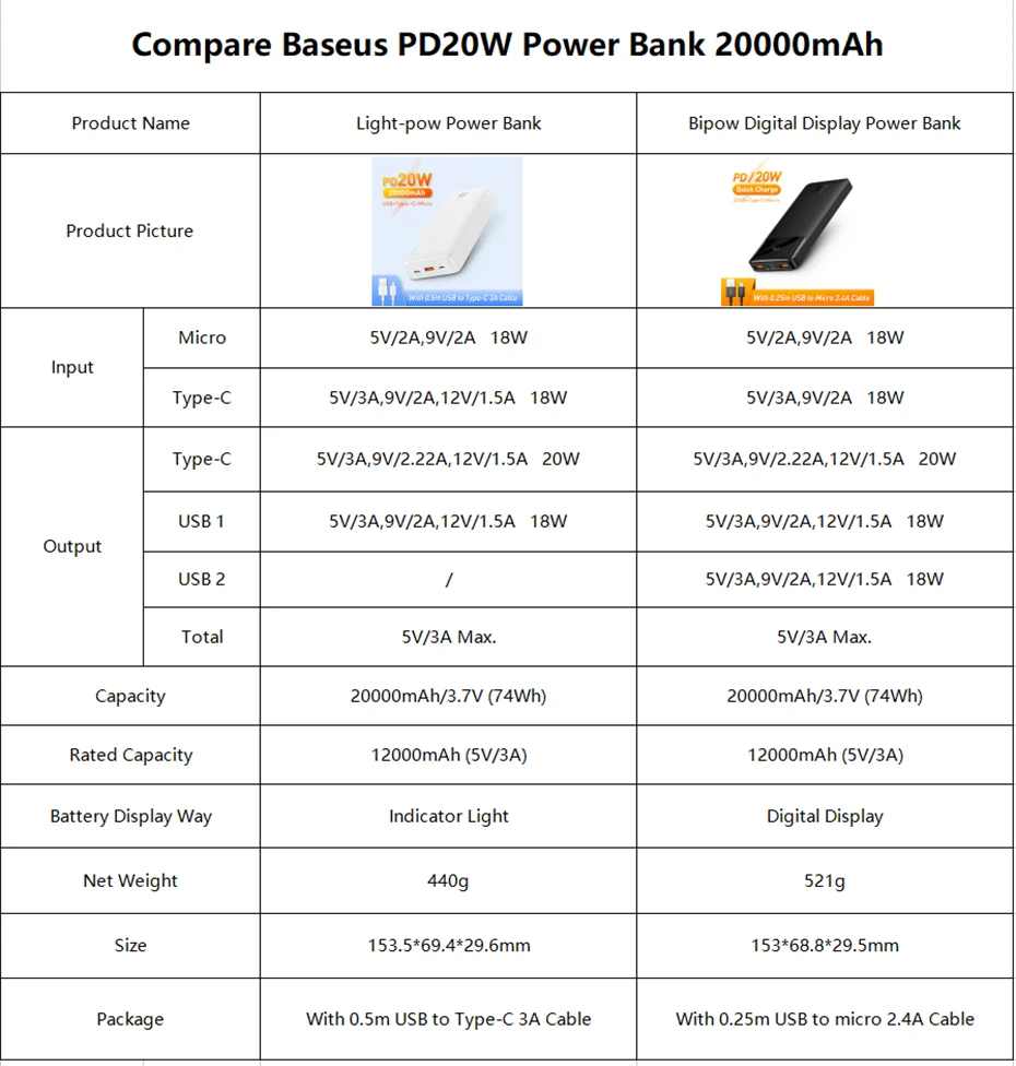 Baseus 20000mAh Power Bank로 번개처럼 빠른 충전을 경험해 보세요. 이 휴대용 충전기는 20W PD(Power Delivery) 및 QC(Quick Charge) 기술을 자랑하므로 장치를 즉시 준비할 수 있습니다. 배터리 부족에 대한 걱정은 이제 안녕, 궁극의 편리함을 만나보세요.