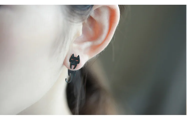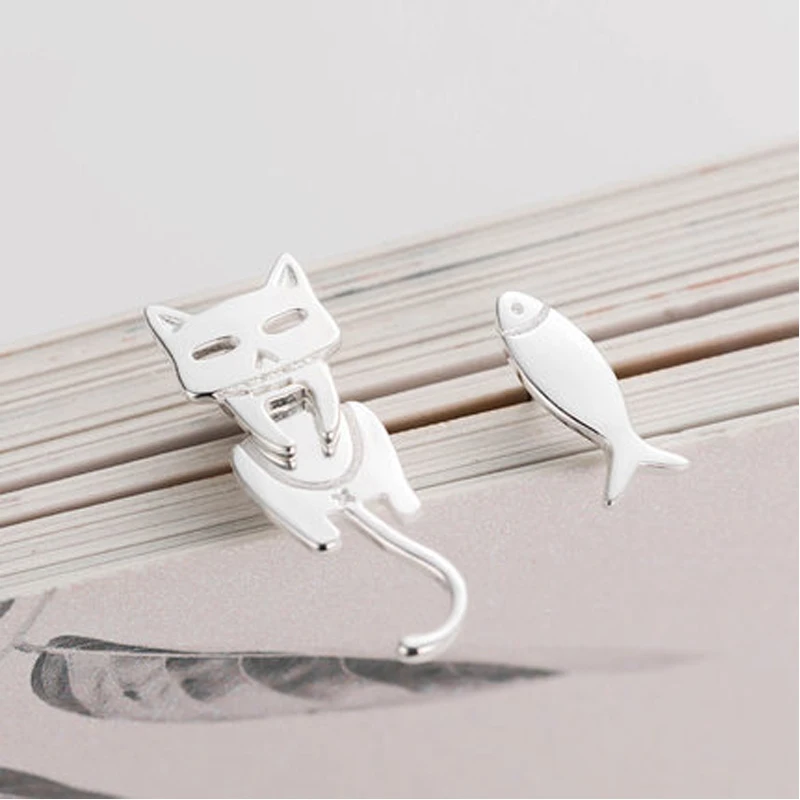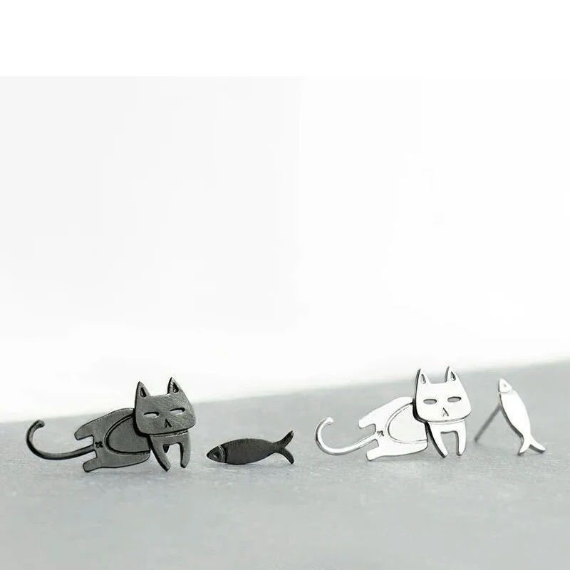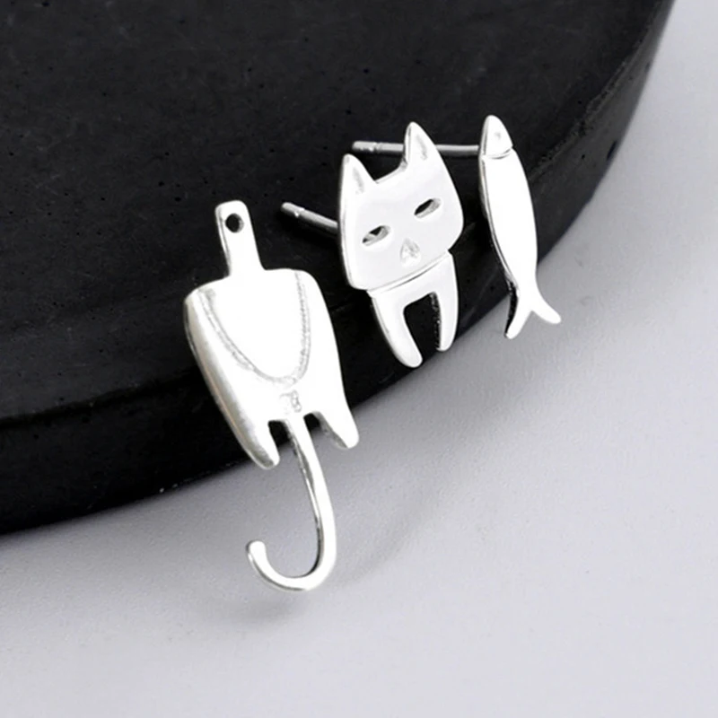 S925 스털링 실버 스터드 귀걸이 귀여운 고양이 물고기 귀 스터드 저자 극성 귀고리 알레르기 방지 Dangler 소설 보석 귀걸이