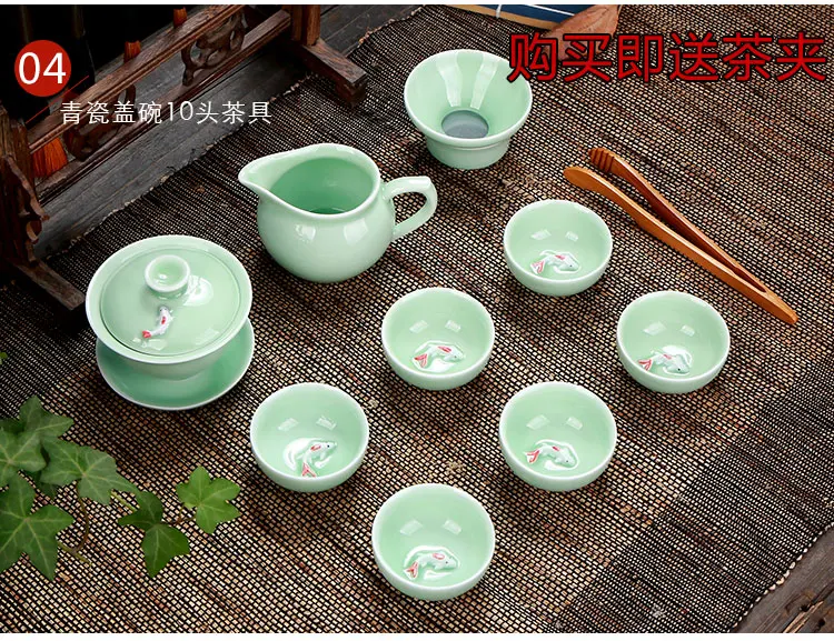 Longquan 청자 생선 차 세트 - 도자기 주전자 및 Gaiwan - 절묘한 차 체험!