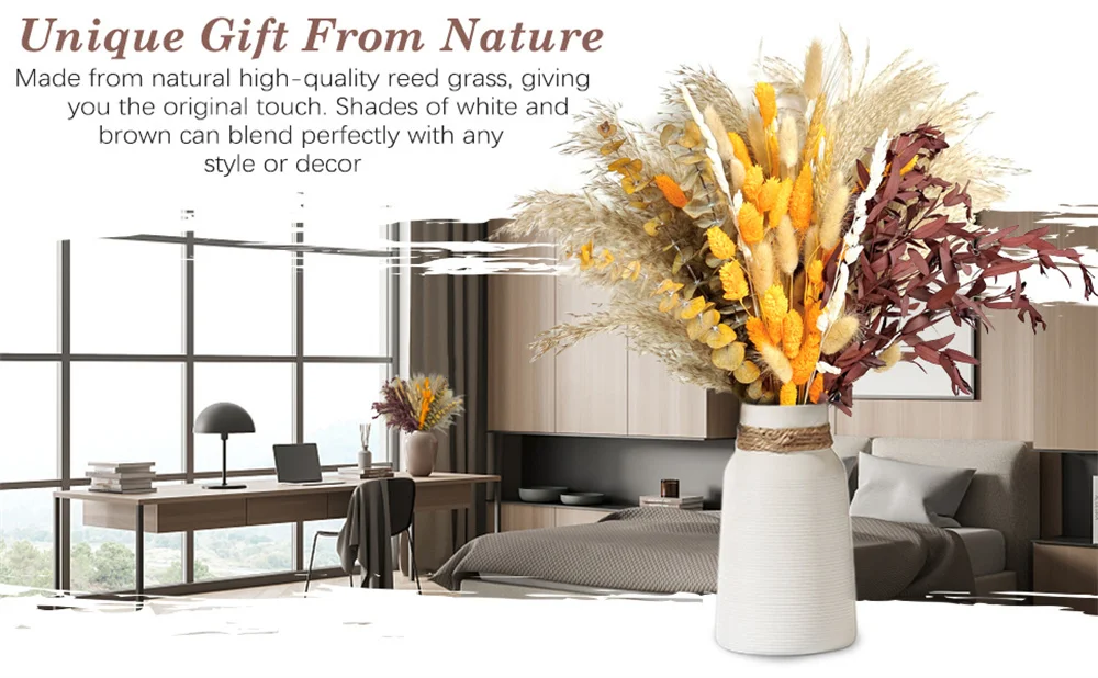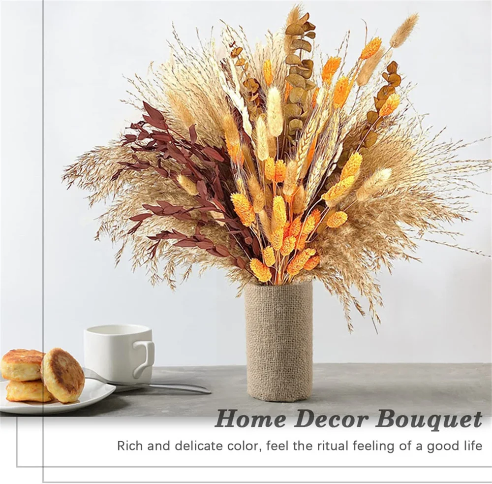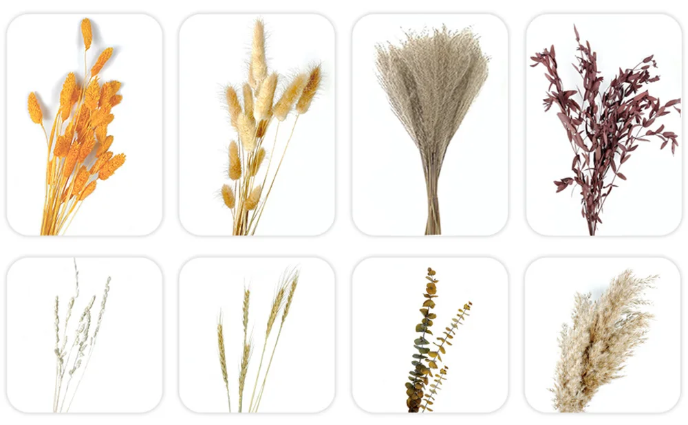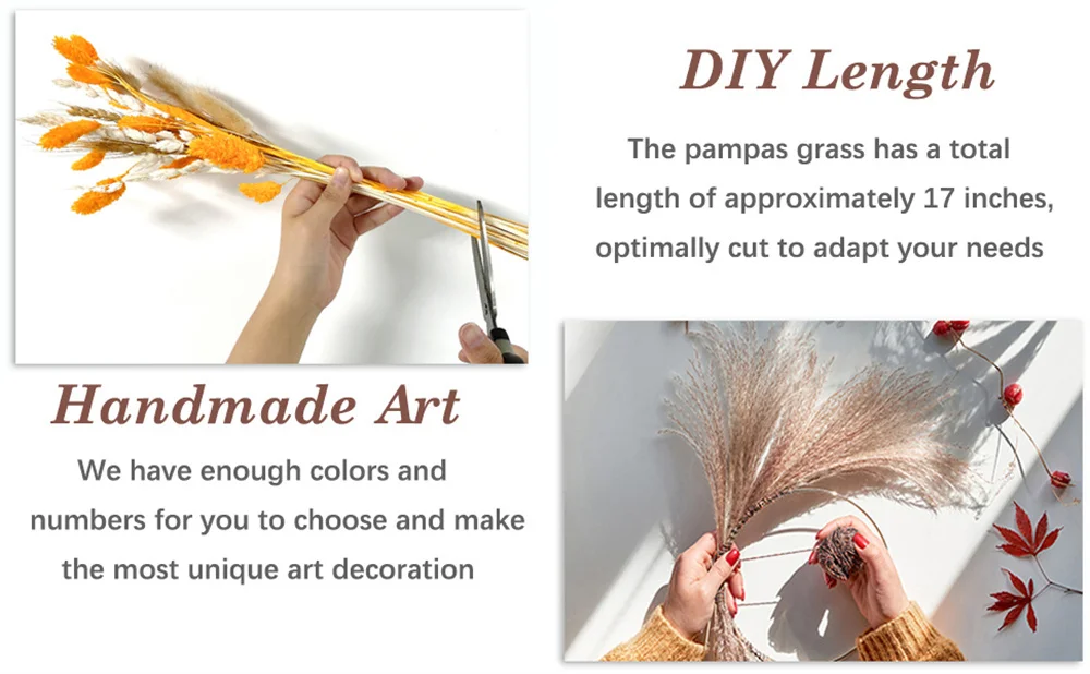 - 30pcs 갈대 잔디, 5pcs 갈색 팜파스 잔디, 4pcs 밀, 20pcs 버니 테일 잔디, 3pcs 레드 이터널 유칼립투스, 3pcs 베이지 이터널 유칼립투스, 30pcs 오렌지 보석 잔디 및 5pcs 화이트 엘핀 잔디 포함