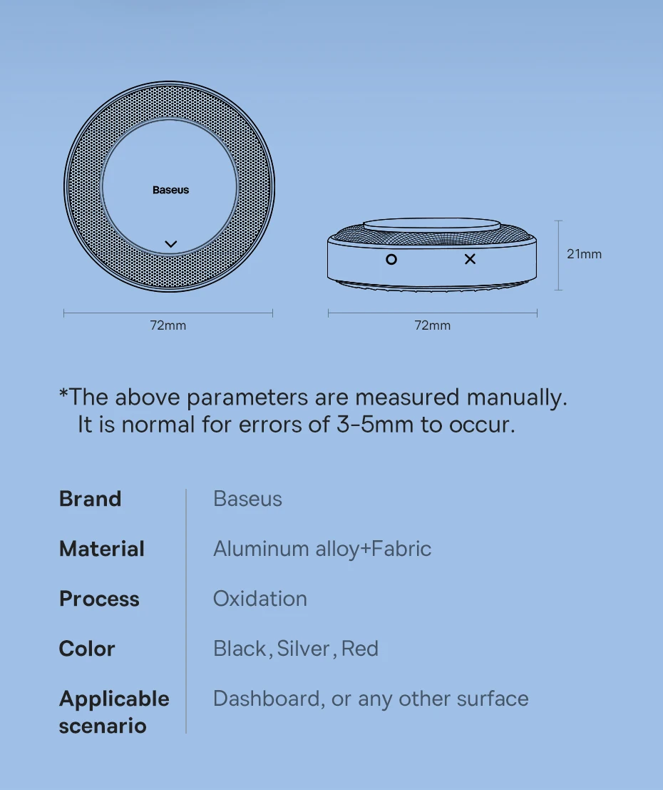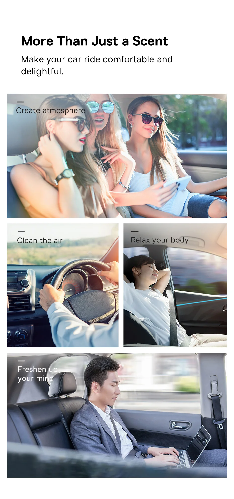 Baseus 공기 청정제 향수로 운전 경험을 향상시키십시오. 이 프리미엄 품질의 향기 디퓨저는 차량 내부를 상쾌하게 하는 영원한 향기를 발산합니다. 조정 가능한 아로마 홀더와 금속 패브릭으로 대시보드에 추가할 수 있습니다. 지금 주문하고 편안하고 상쾌한 드라이브를 즐기십시오!