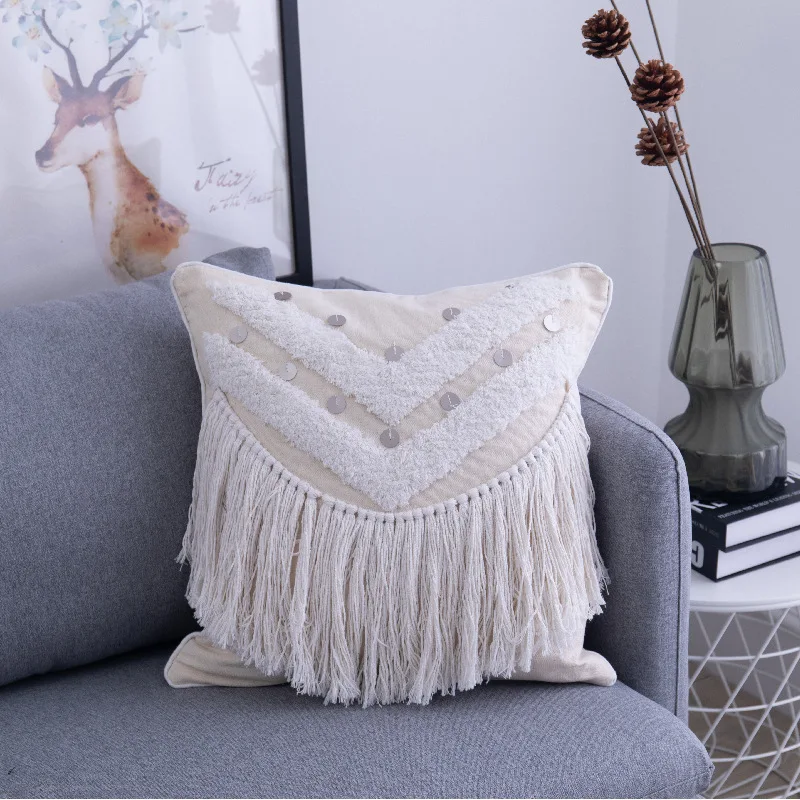 다이아몬드 프린지와 모로코 스타일 베이지 베개 커버