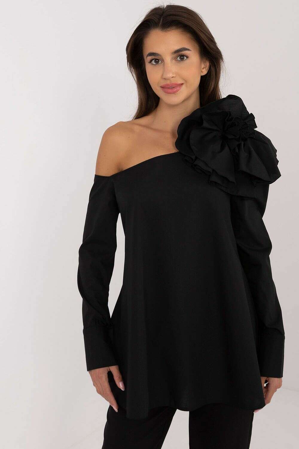Elegant blouse made of smooth, monochromatic material, ideal for formal occasions and work. Made of high quality cotton, it provides comfortable wear and an elegant look. A decorative fabric flower in the form of a brooch on the left shoulder adds a sophisticated touch, making it unique and stylish. The blouse has an asymmetrical neckline, which emphasizes the modern design, while the long sleeve and standard length make it a versatile closet item. The zipper closure at the back ensures comfort and a perfect fit. An ideal choice for women who appreciate classic elegance with original details.