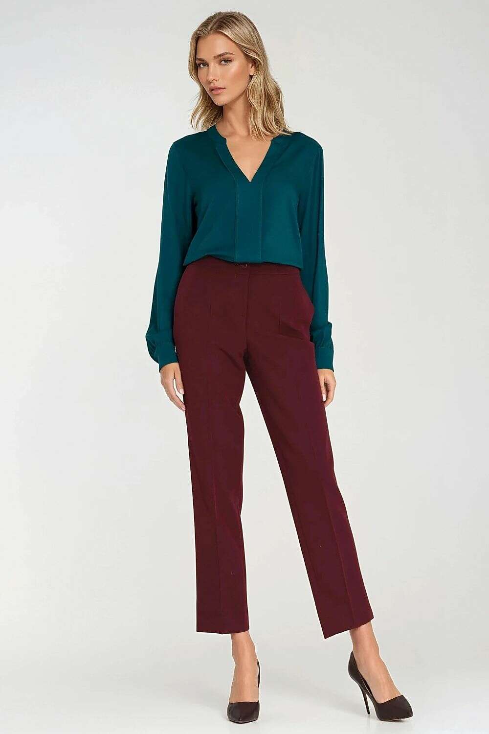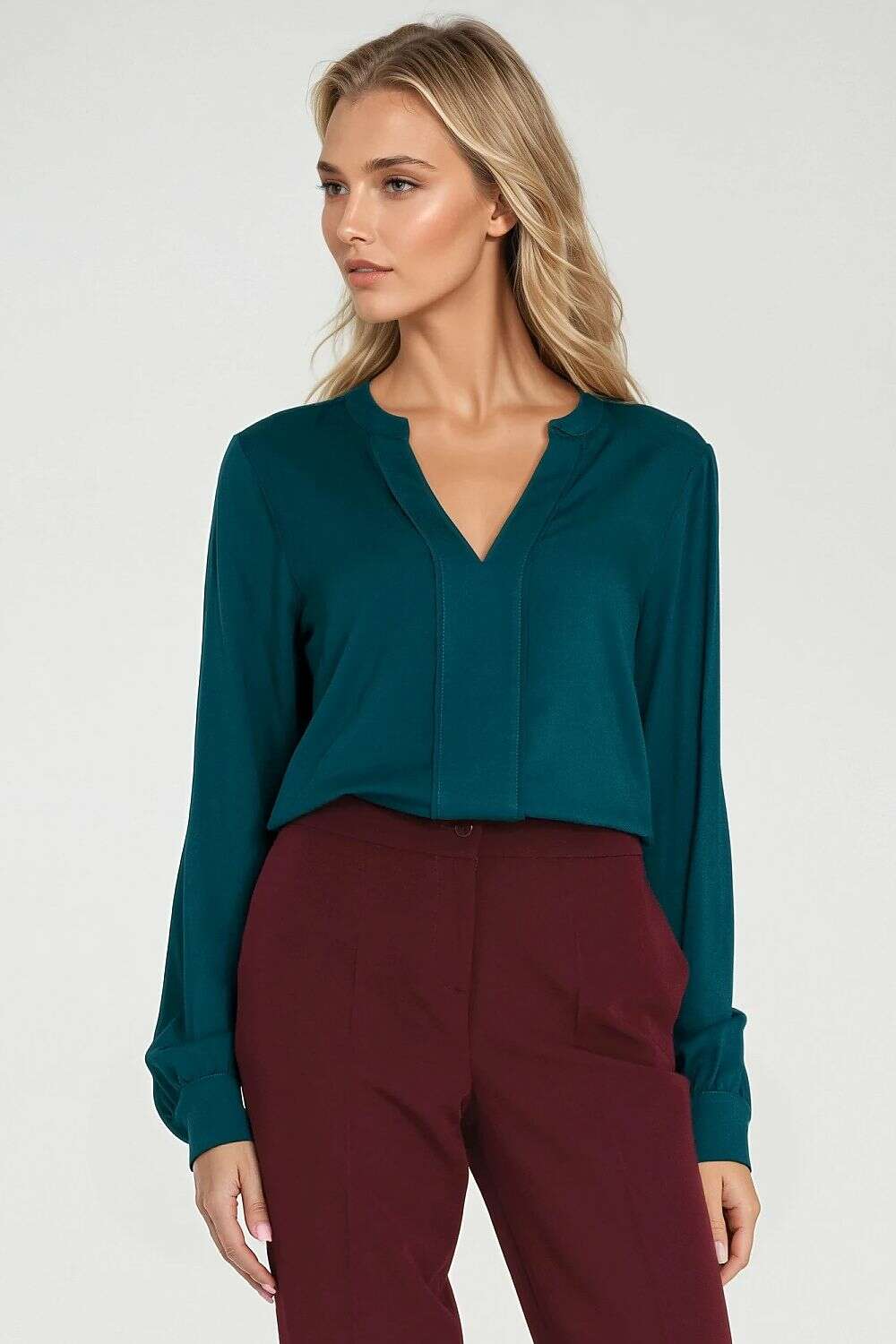 Discover the Classic Women's V Neck Pleated Blouse in Soft Viscose—a timeless wardrobe essential that blends elegance with everyday comfort. Crafted from 100% viscose, this blouse is light, breathable, and drapes beautifully to flatter every silhouette. The regular cut and the refined V-neckline with a wide pleat visually slim the torso while adding a touch of sophistication.