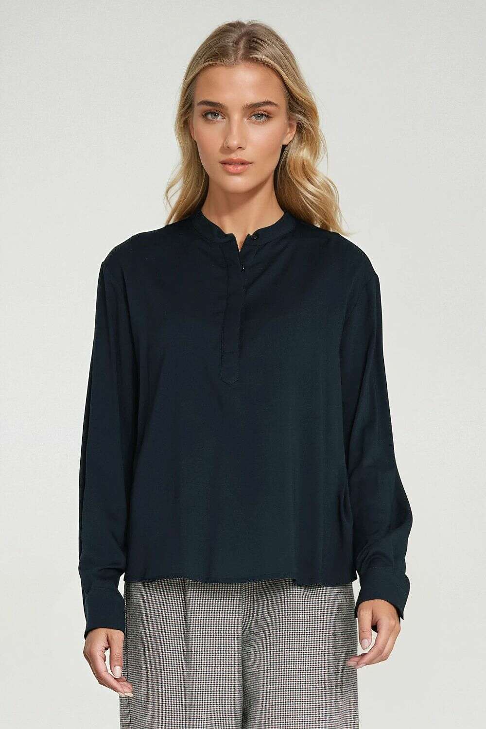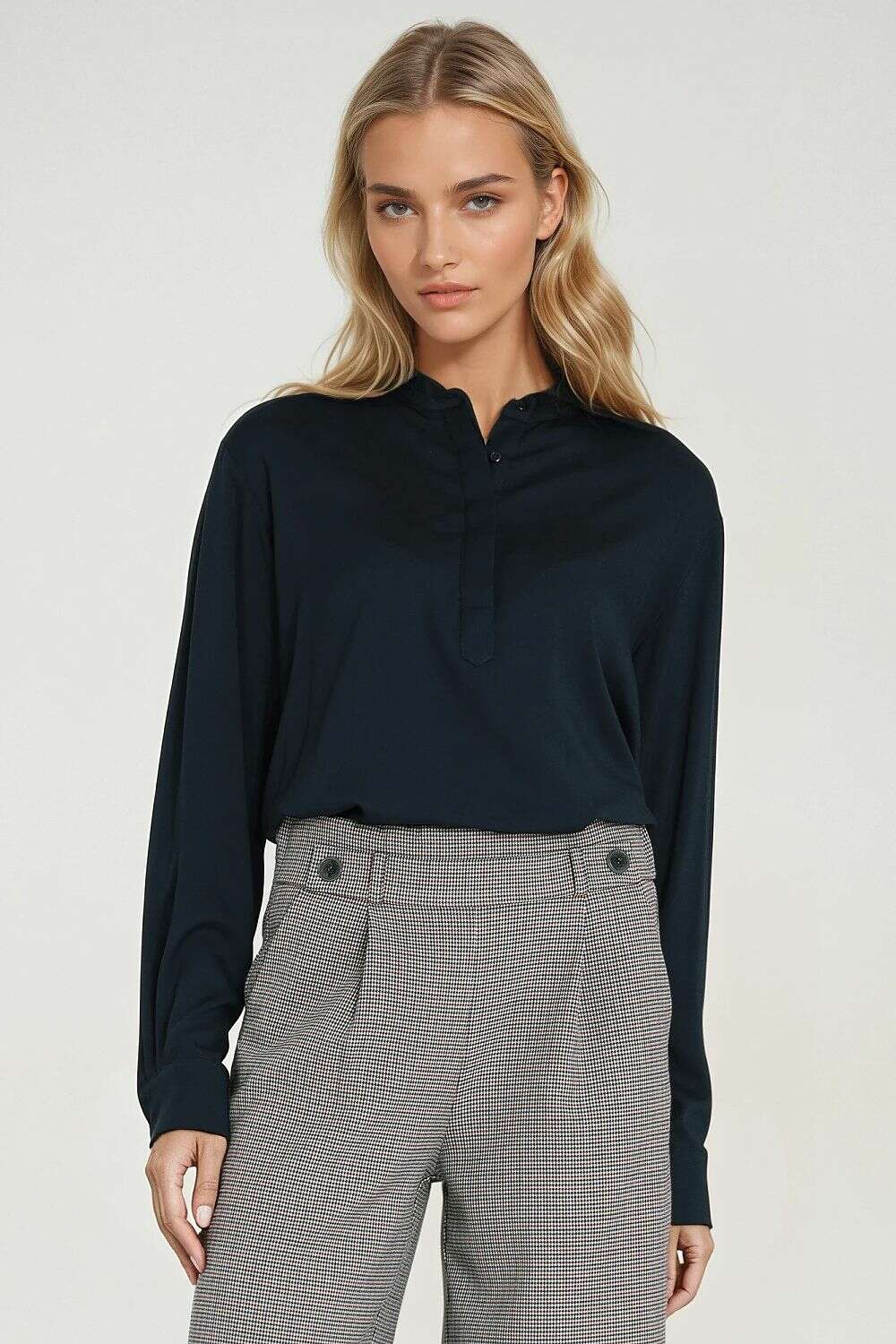 The polo neckline with a stand-up collar adds a refined touch, while long sleeves with cuffs and a clean, halfway buttoned placket deliver minimalist sophistication.