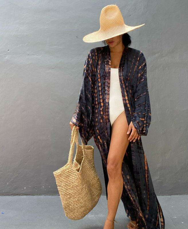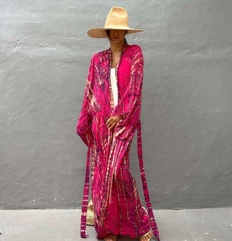 수영 후 몸을 가리는 반투명 가디건으로 웨이스트 타이가 있는 긴 실루엣으로 눈길을 끄는 타이다이 패턴으로 감쌉니다.
