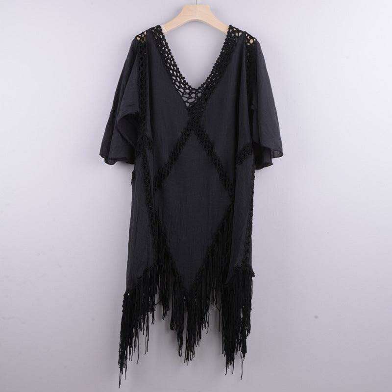 약간의 돌먼 소매와 흔들리는 프린지가 있는 이 크로셰 판초 니트로 수영 후 몸을 가리세요.