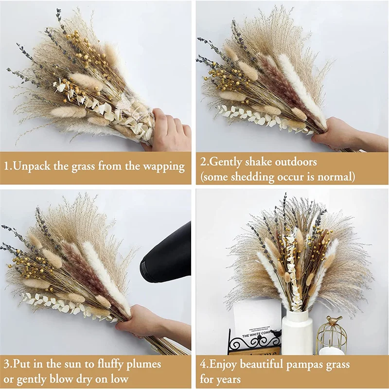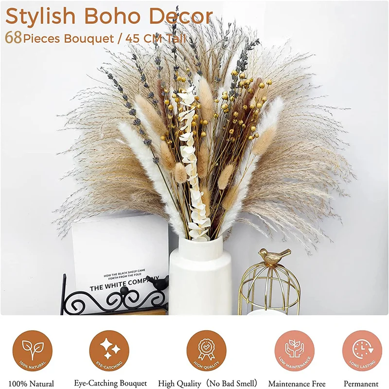 - 68피스 드라이 플라워 부케: 화이트 팜파스 그래스 12개, 천연 팜파스 그래스 5개, 토끼 꼬리 10개, 라벤더 10개, 갈대 30개, 아카시아 1개, 유칼립투스 1개로 구성됩니다.