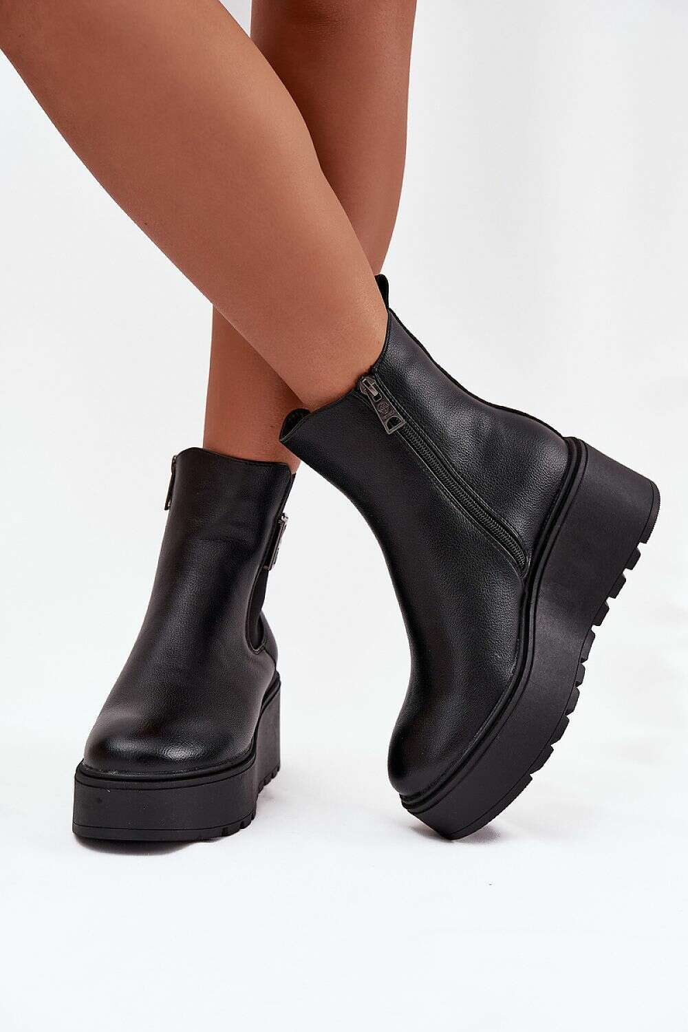 Women's ankle boots from the Vinceza brand. Made of high-quality eco leather, set on a stable platform connected to a wedge heel, subtly lift the silhouette and provide comfort for wearing all day long. The model fastened with a zipper makes it easy to put on quickly, and the lining ensures pleasant warmth on cooler days. Additionally, the decorative detail on the side of the upper introduces an elegant, fashionable accent, making the boots look great with both casual and more formal outfits.