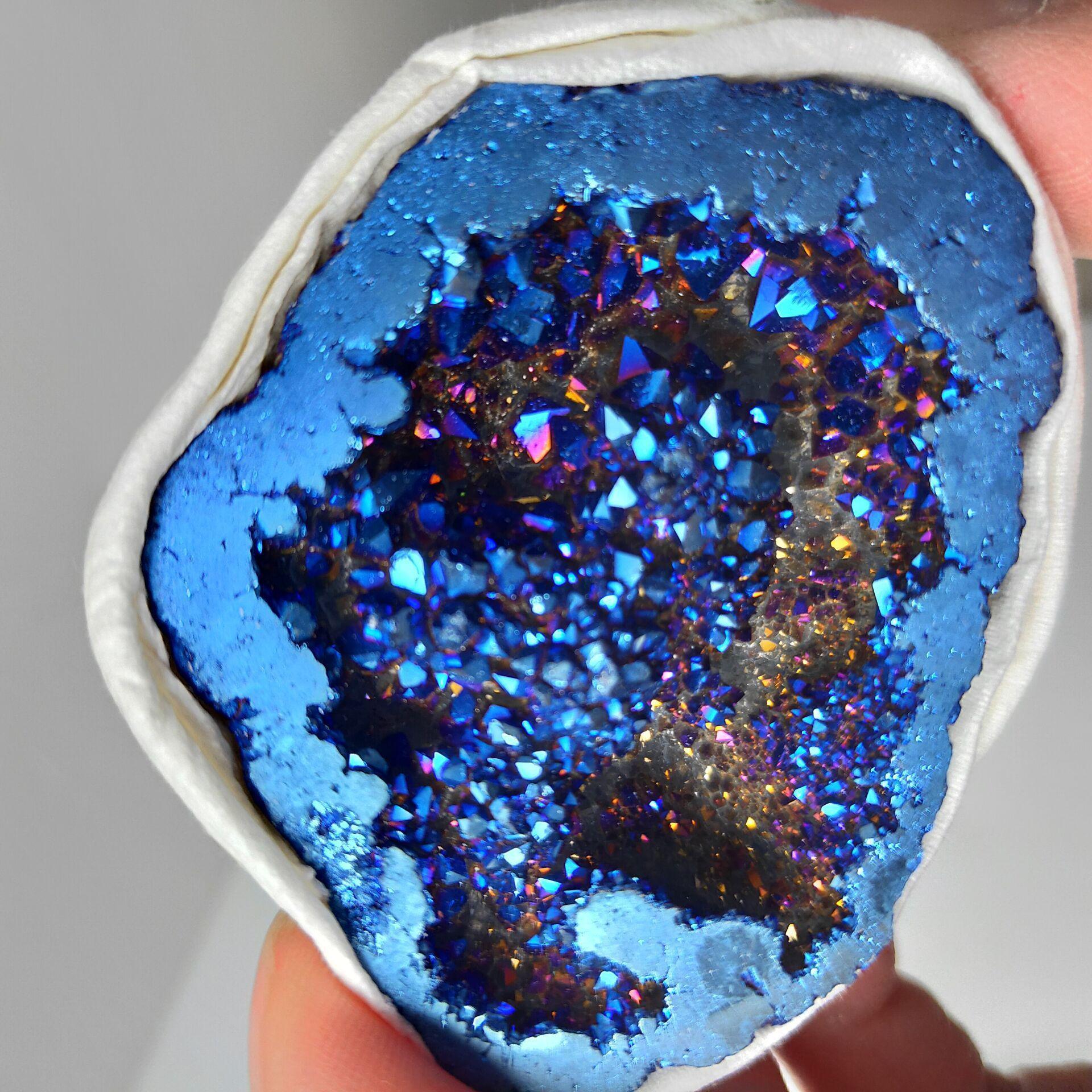 1pcs 천연 천사 오라 마노 Geode 크리스탈 구멍 광물 표본 깨끗한 클러스터를 포함 전기 도금 티타늄 코팅