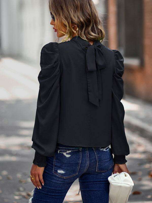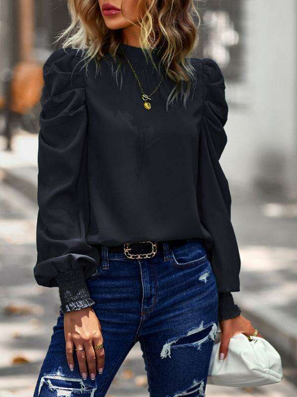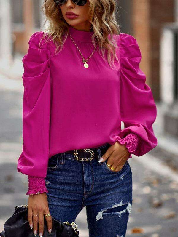 스목 커프 셔링 긴 소매 블라우스가 있는 모의 목의 여성용 단색