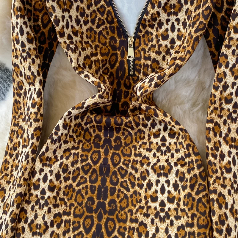 2022년 가을 컬렉션의 최고의 레지스턴스인 럭셔리 레오파드 시스 드레스로 비교할 수 없는 매력과 세련미에 빠져보세요. 최고급 퍼스트 레이어 소가죽과 신축성이 뛰어난 폴리에스터로 꼼꼼하게 제작된 이 드레스는 화려함과 고급스러움을 보여줍니다.