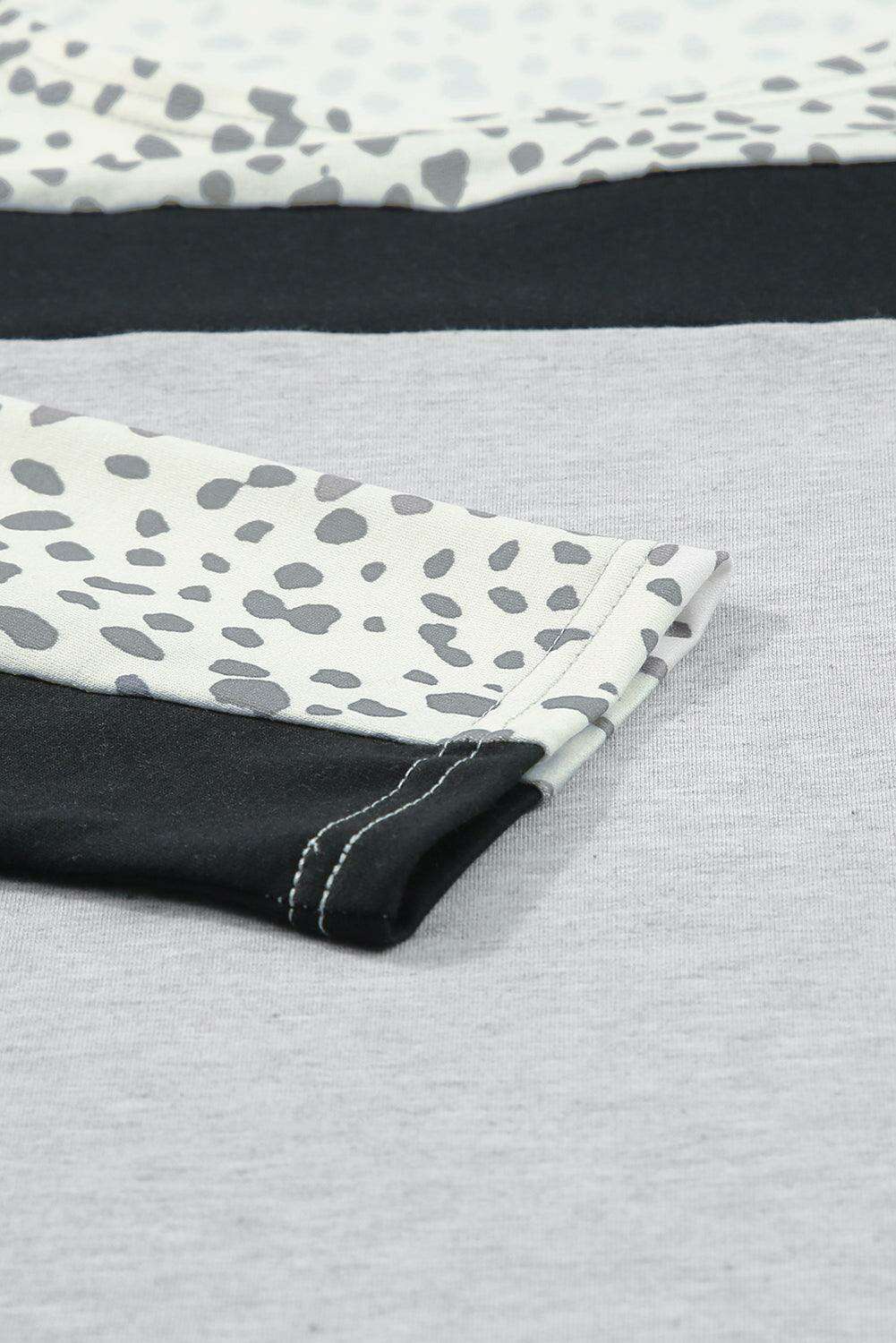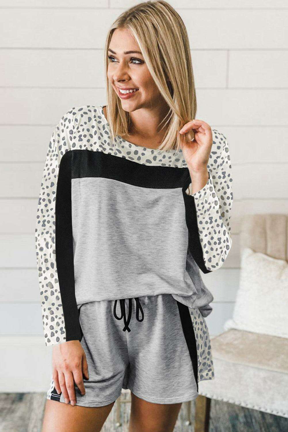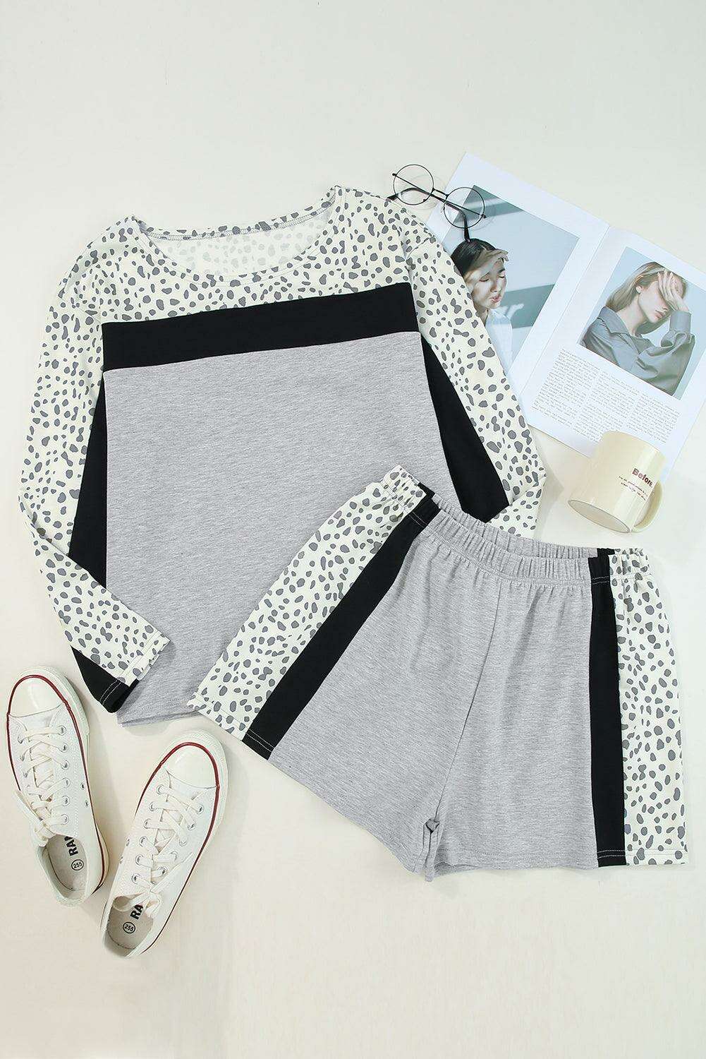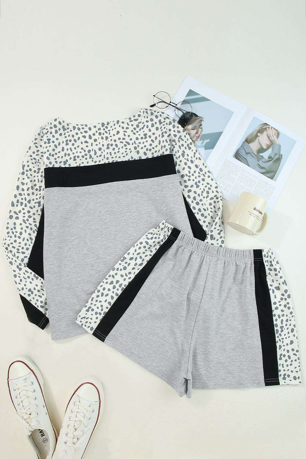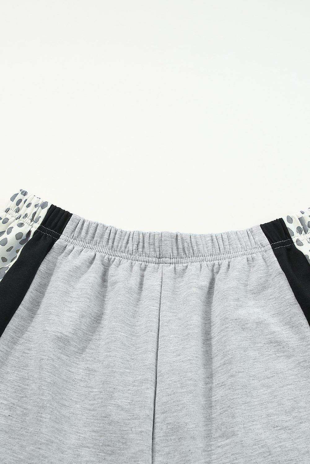 그레이 레오파드 컬러블록 패치워크 풀오버 및 반바지 세트