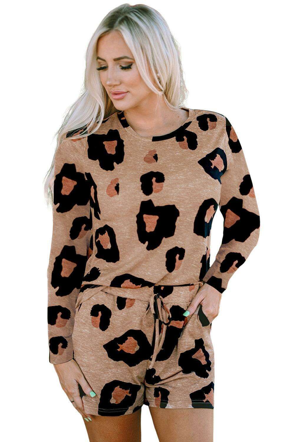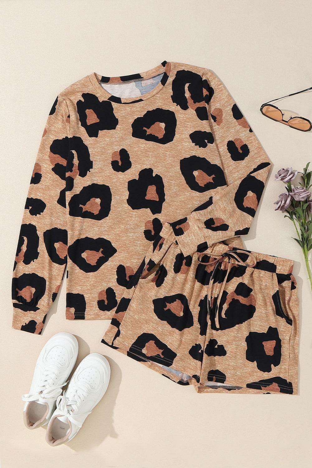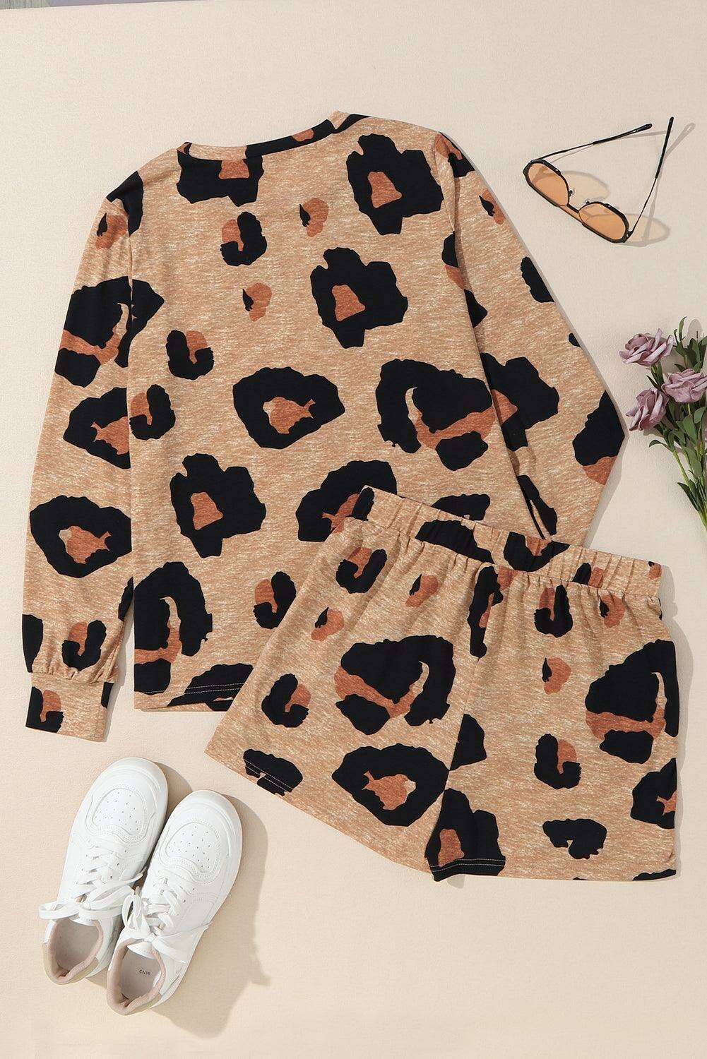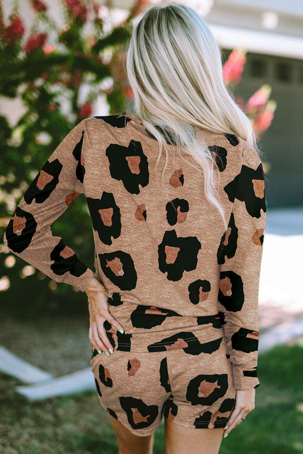 레오파드 동물 프린트 긴 소매 풀오버 및 반바지 캐주얼 의상
