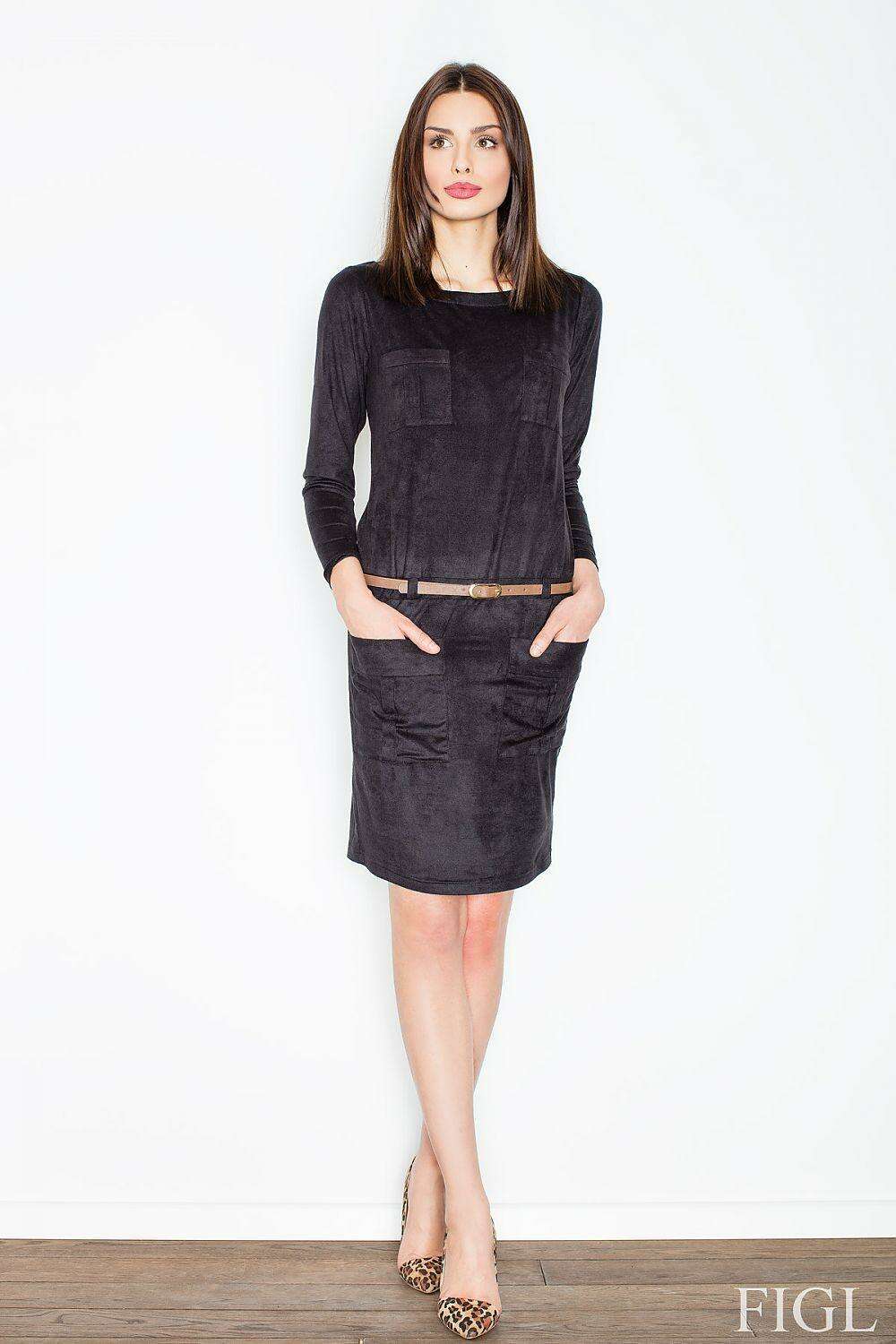 Elegant Faux Suede Long Sleeve Mini Dress with Functional Pockets and Decorative Belt - Model 52604