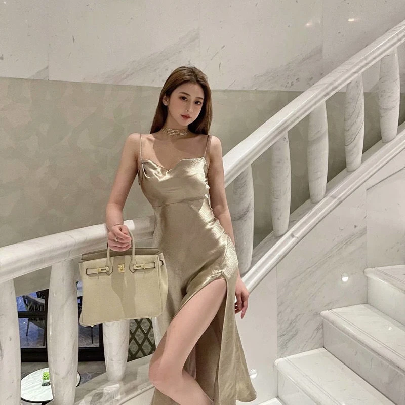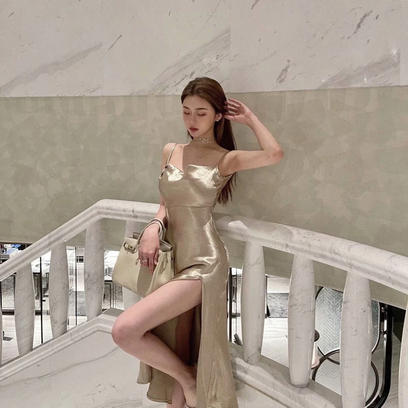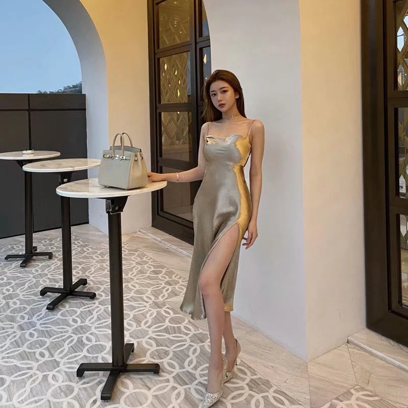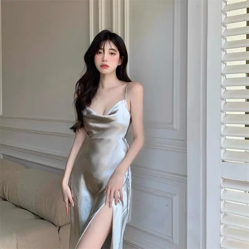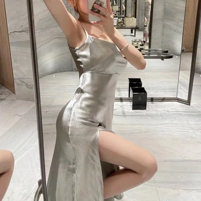 빈티지 슬링 드레스 여름 섹시한 민소매 실버 반짝 이는 롱 드레스 여성 가운 솔리드 새틴 슬립 높은 슬릿 Sundress 파티 드레스