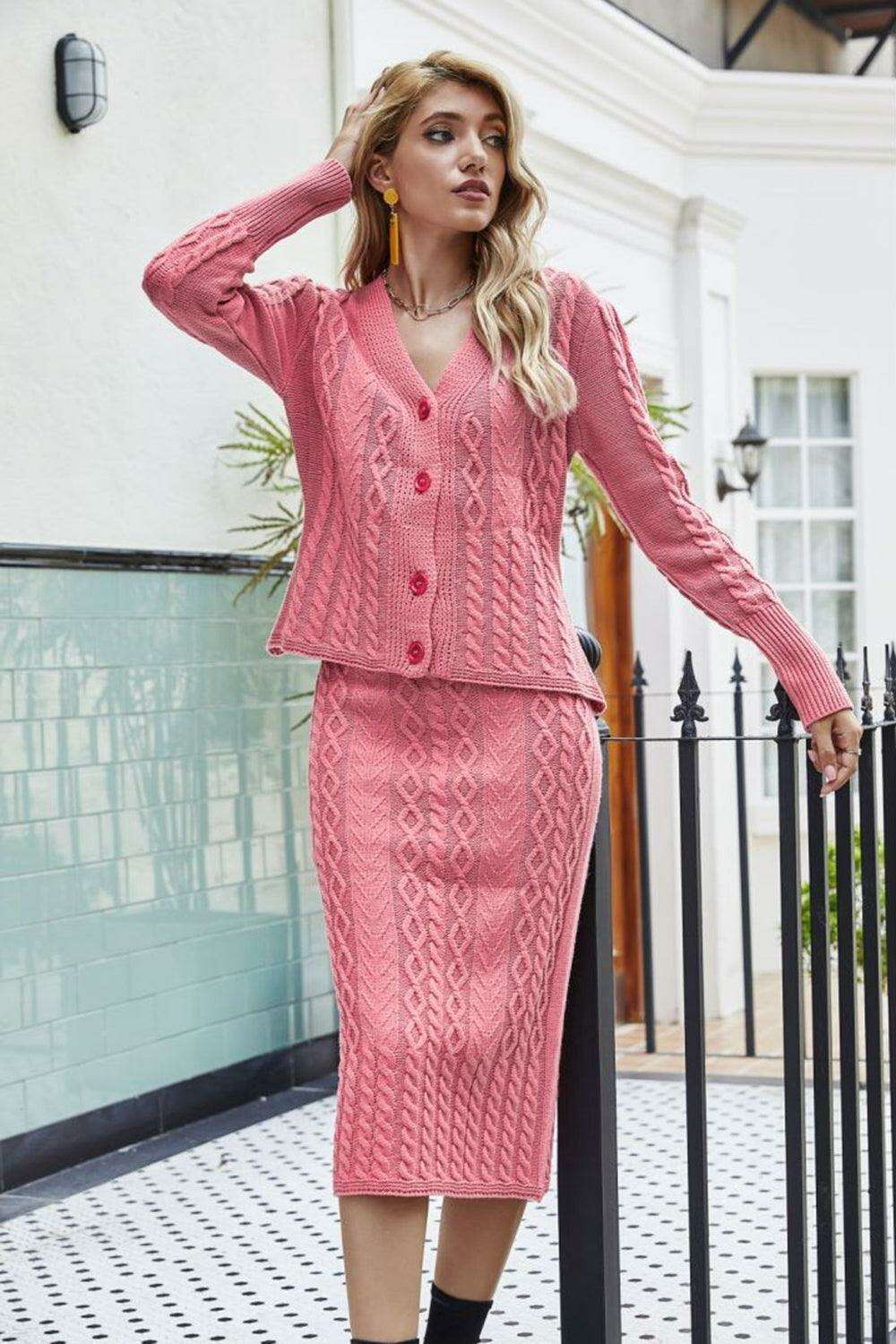 믹스니트 브이넥 가디건과 니트 스커트 세트