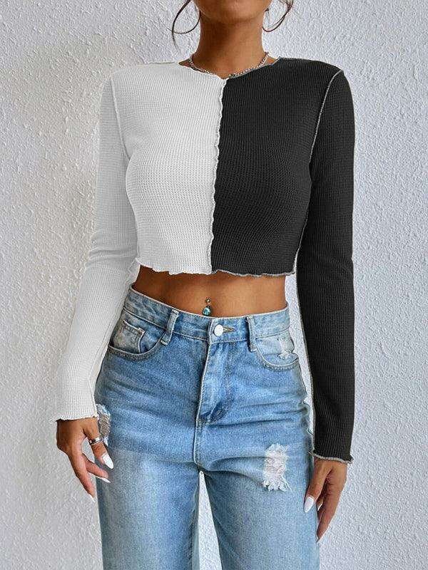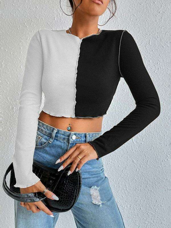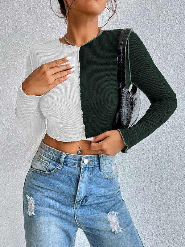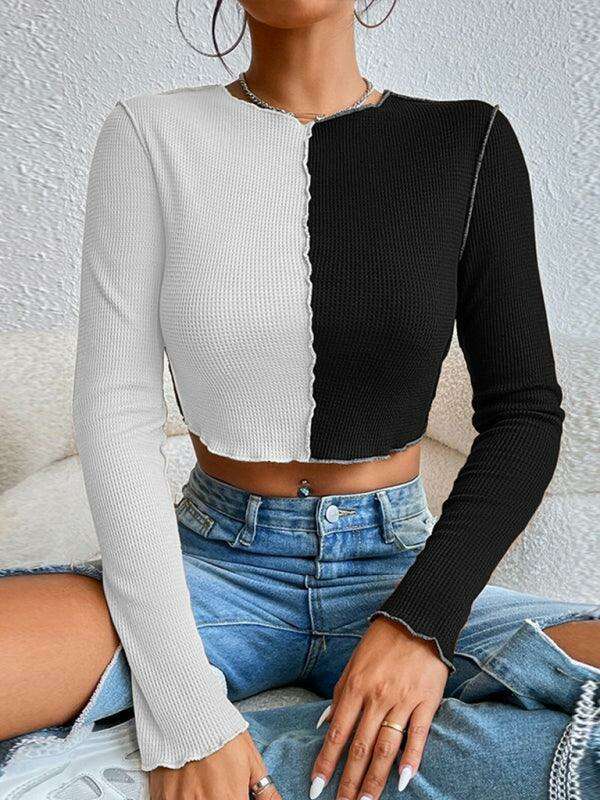 여성 캐주얼 컬러 블록 와플 반바지 긴팔 티셔츠