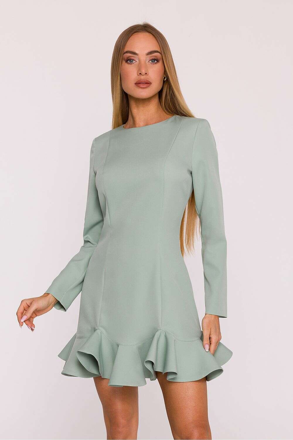 Subtle and feminine dress made of smooth fabric with a matte finish is a perfect choice for many occasions. The simple form has been enhanced with a fancy ruffle at the bottom, which gives the whole dress lightness and girlish charm. The model features a classic, semi-round neckline and long sleeves, making it look elegant and timeless. The hidden zipper at the back ensures easy dressing and a neat finish. The lack of pockets and lining makes the dress light, comfortable, and beautifully drapes on the silhouette. The design subtly emphasizes the figure - the top features a simple, slightly waisted line with shaping seams, while the flared bottom with a ruffle works beautifully in motion. The mini length adds freshness and a modern character to the outfit. Designed and made in Poland, with women in mind who appreciate simple elegance with a hint of originality.