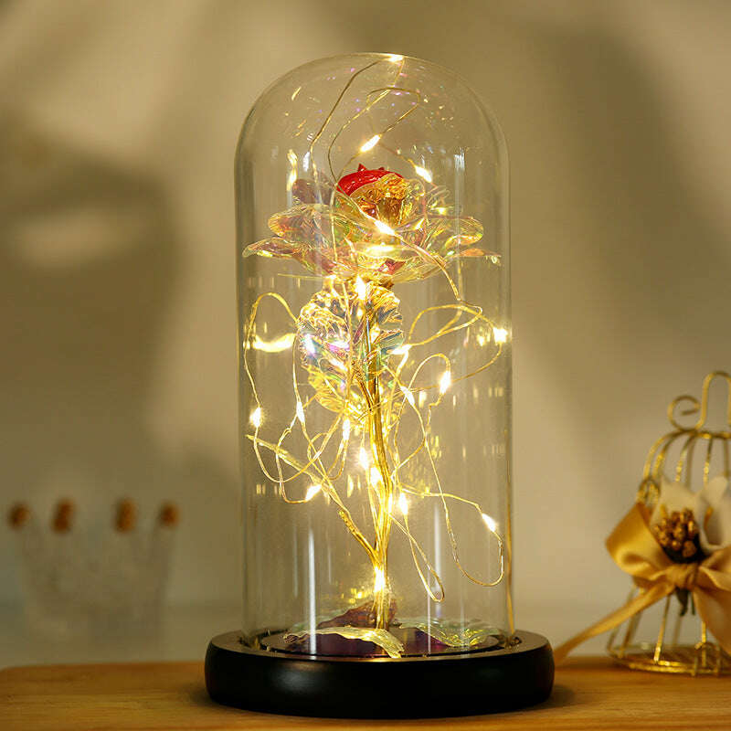 At the heart of this piece is a colorful gold foil rose encased in a delicate glass cover, surrounded by vibrant plastic flowers. The glass shade adds a luminous glow, while the subtle illumination enhances the shimmer of the gold foil, making it a captivating centerpiece for shelves, mantels, desks, or entryways.