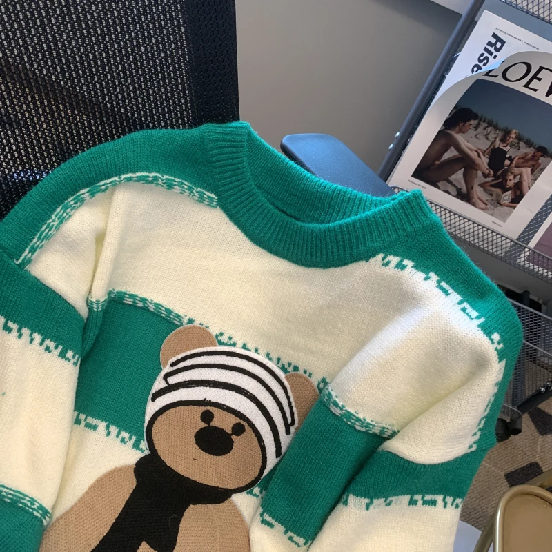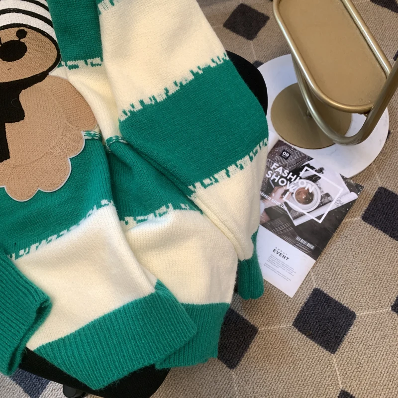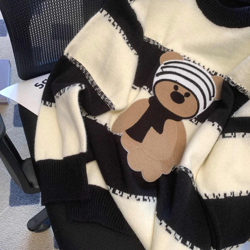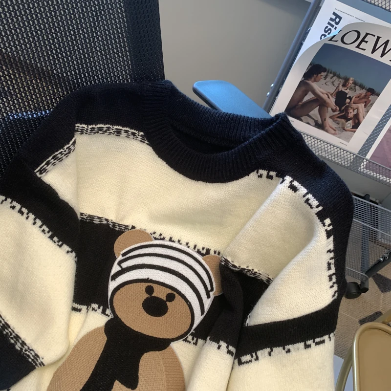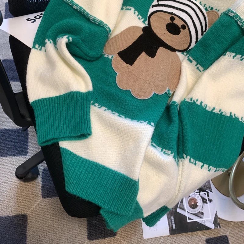 베어 스트라이프 니트 스웨터 풀오버 여성 대형 만화 패션 탑 긴 소매 라운드 넥 느슨한 캐주얼 세련된 점퍼