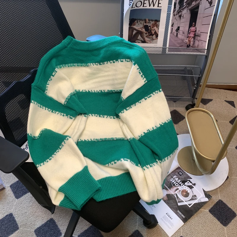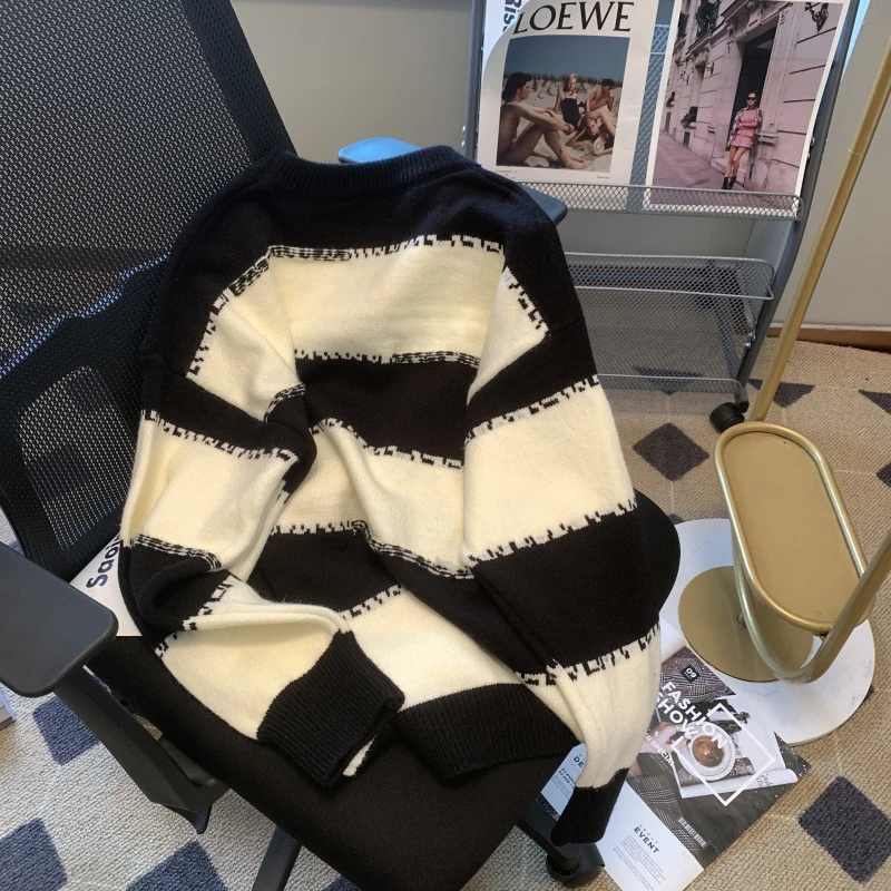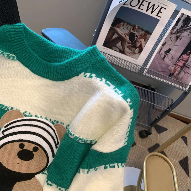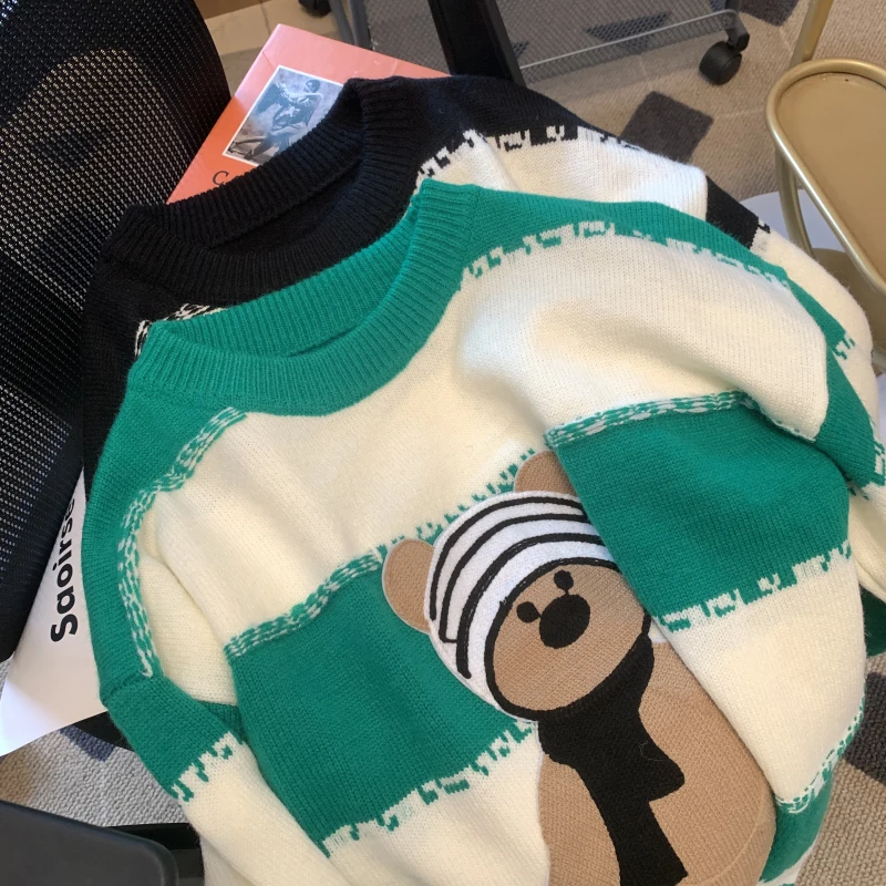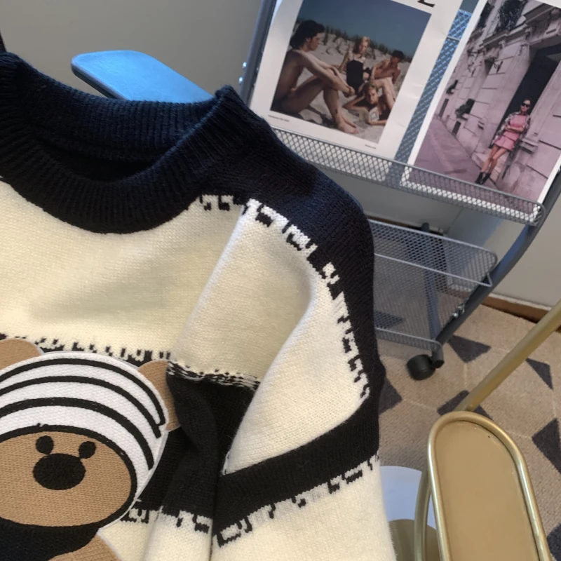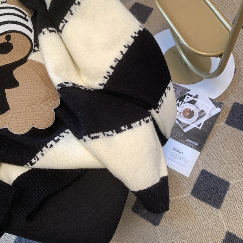 베어 스트라이프 니트 스웨터 풀오버 여성 대형 만화 패션 탑 긴 소매 라운드 넥 느슨한 캐주얼 세련된 점퍼