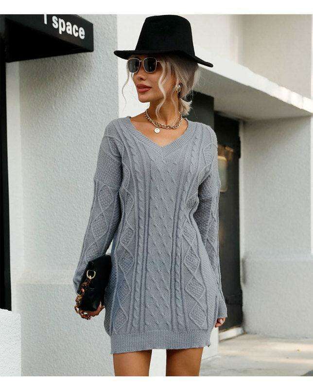 Elevate your winter wardrobe with the Cozy Grey V-Neck Sweater Dress – a must-have for anyone looking to combine warmth and style!