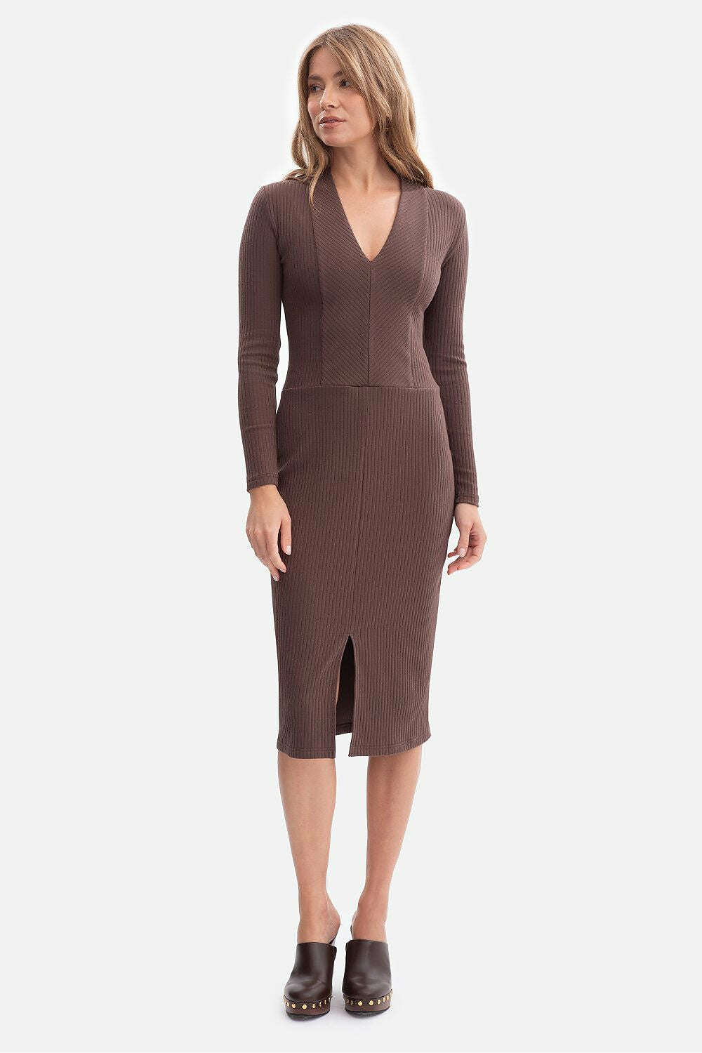 Dress made of ribbed fabric weighing 250 g, which beautifully fits the silhouette and ensures comfort when wearing. The model is put on over the head, without pockets and lining, maintained in a minimalist, elegant style. The V-neck subtly slims the neck and adds a feminine character. Long, fitted sleeves emphasize the shoulder line, and the front slit at the bottom gives the dress lightness and sensuality, while also facilitating freedom of movement. The tailored cut with a clearly accentuated waist beautifully emphasizes the proportions of the silhouette. The midi length, reaching below the knee, makes the dress combine classic elegance with a modern accent. Designed and made in Poland from fabric produced in Łódź, it is a proposition for women who value quality, simplicity, and timeless chic.