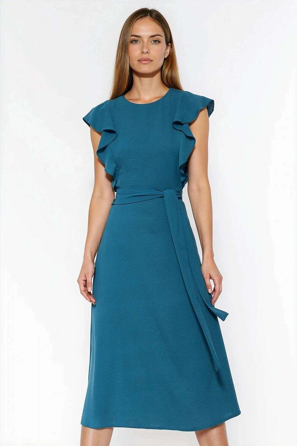The dress features delicate ruffled sleeves that add a touch of romance, while the stretch fabric (Spandex 5% + Polyester 95%) ensures ease of wear all day long. Versatile enough for work, meetings with friends, or special occasions, it adapts to every moment with effortless polish.