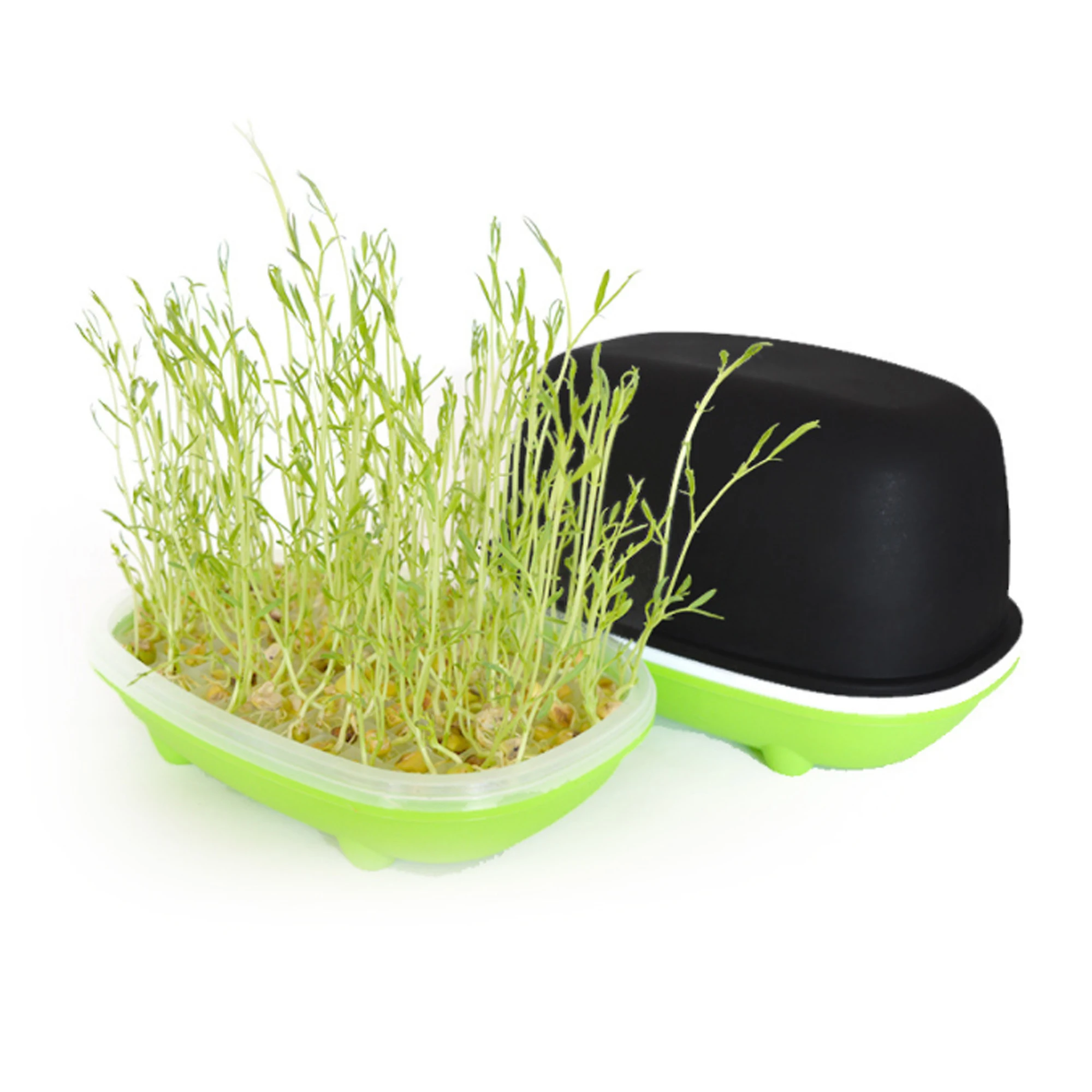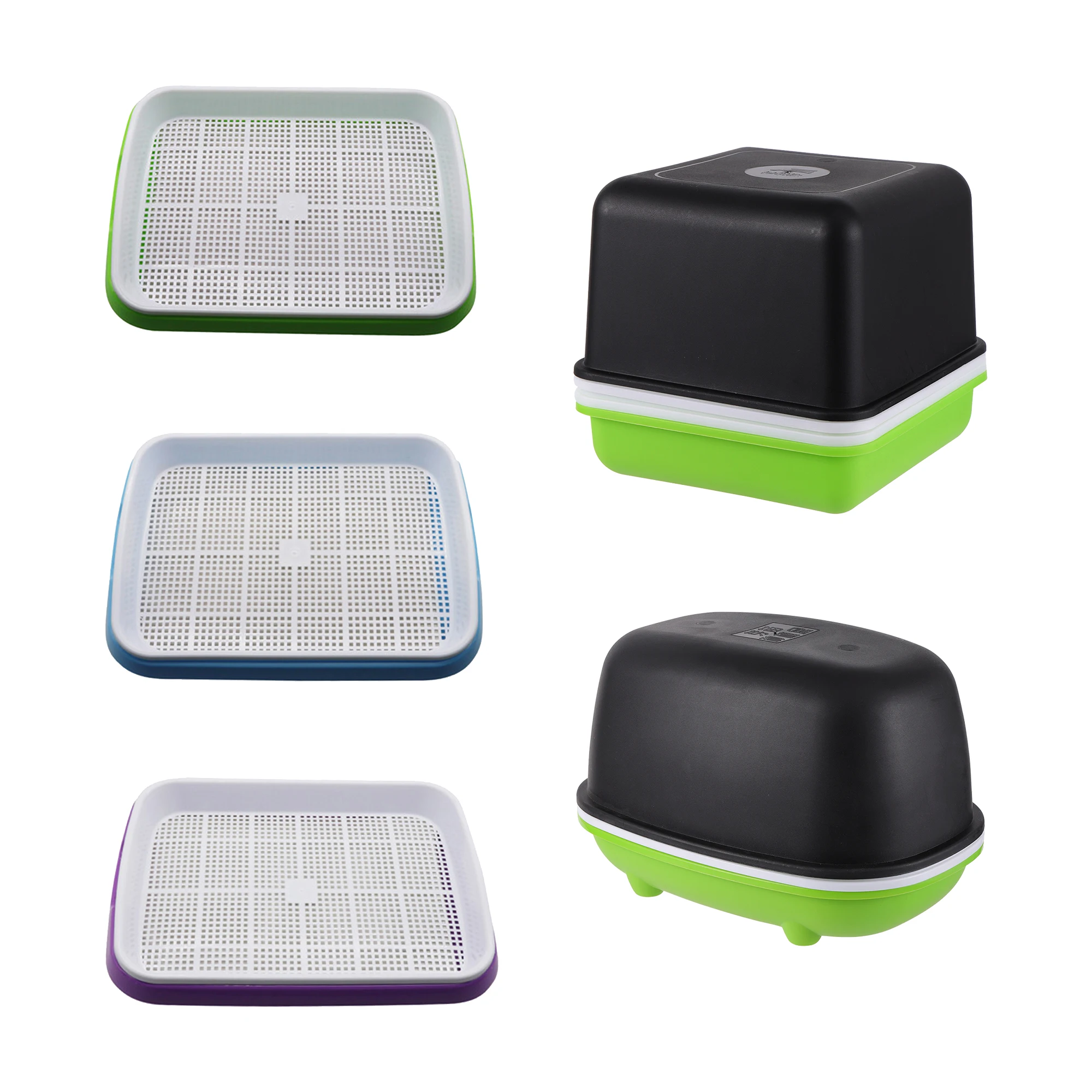 【세부 사항】: 다음을 포함하는 완벽한 발아 트레이 세트: 검은색 후드 1개, 희박한 흰색 대형 그리드 트레이 1개(정사각형에는 조밀한 작은 그리드 트레이가 있음), 녹색 물통 1개. 격자 트레이는 배수를 용이하게 하고 작은 격자 트레이 씨앗이 떨어지는 것을 방지합니다.