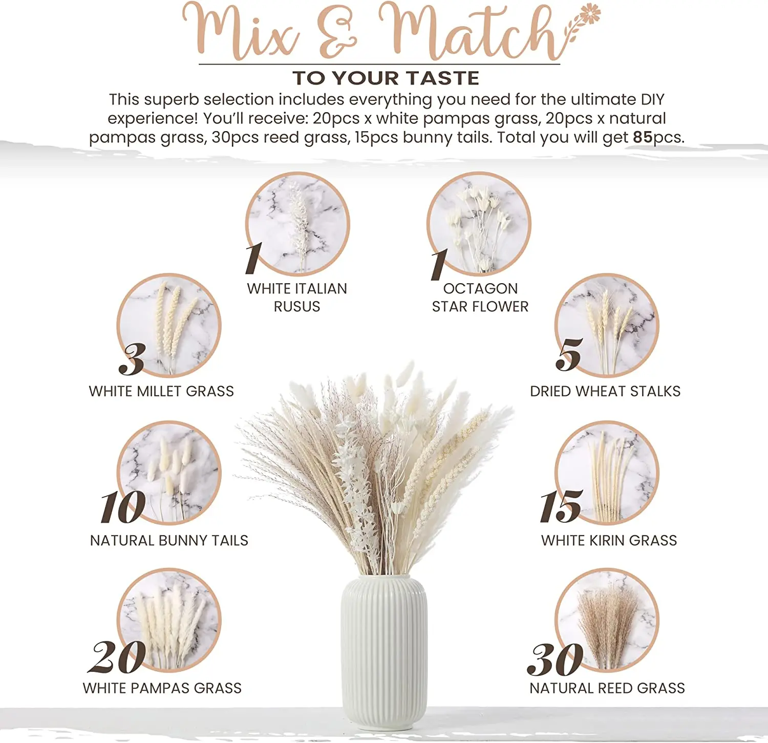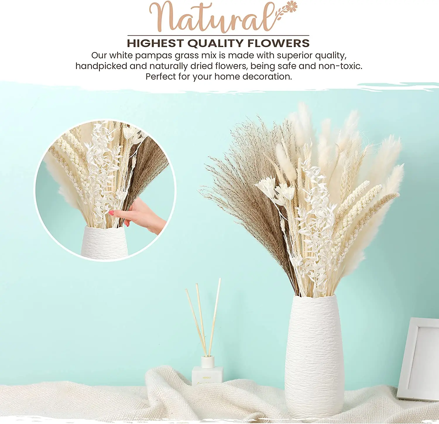 2. 최고 품질의 천연 꽃: 우리의 흰색 팜파스 잔디 혼합은 우수한 품질, 손으로 직접 고른 자연 건조 꽃으로 만들어지며 100% 안전하고 무독성입니다. 뛰어난 결과를 얻으려면 팜파스를 부풀리는 방법을 설명하는 삽입물을 확인하십시오!