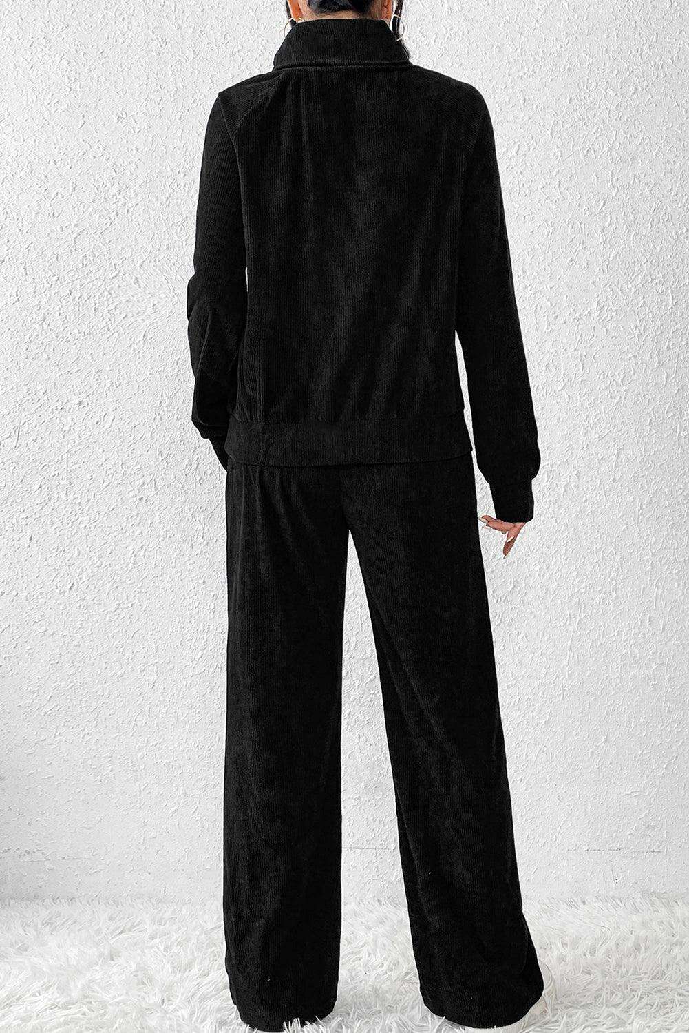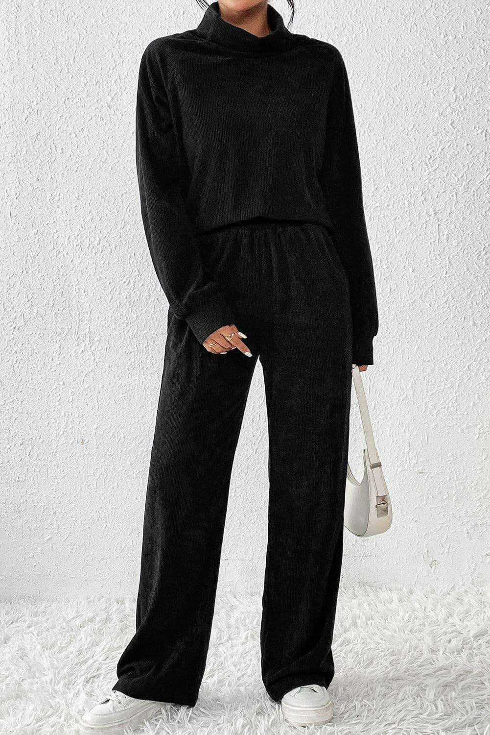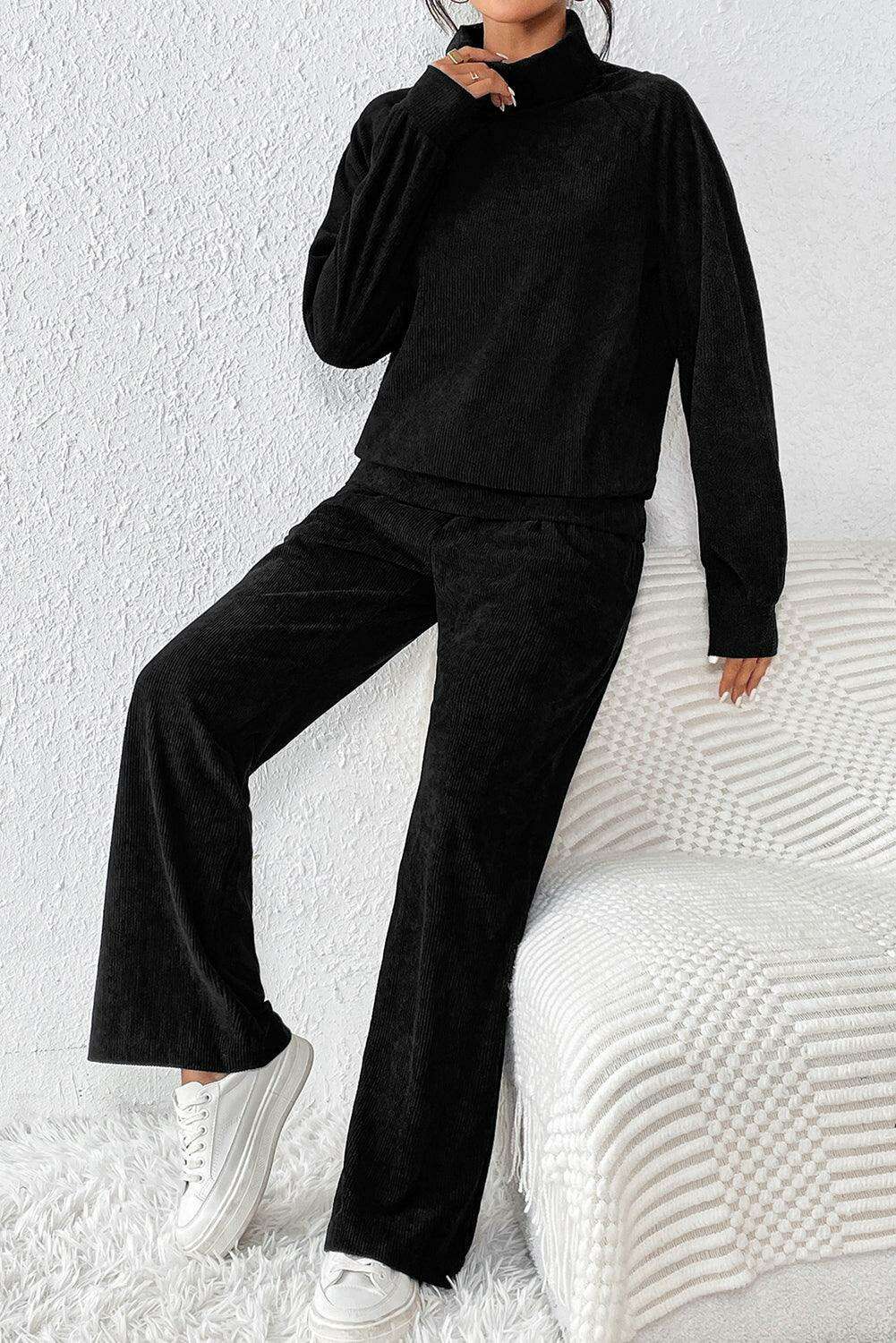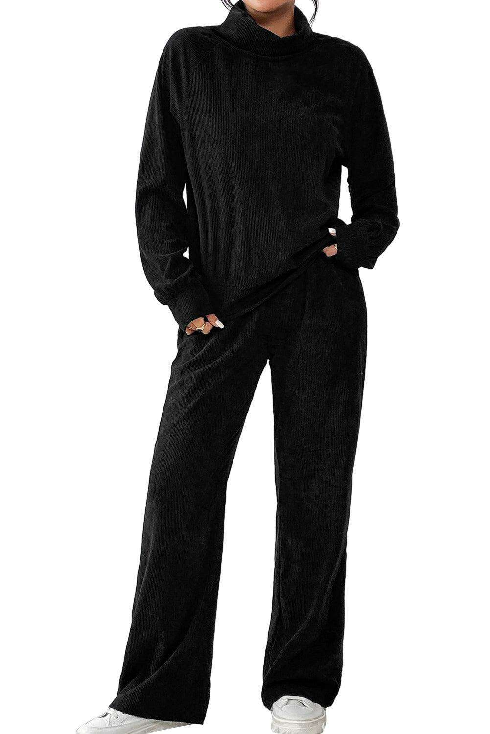 블랙 솔리드 컬러 코듀로이 하이넥 탑 & 팬츠 투피스 세트