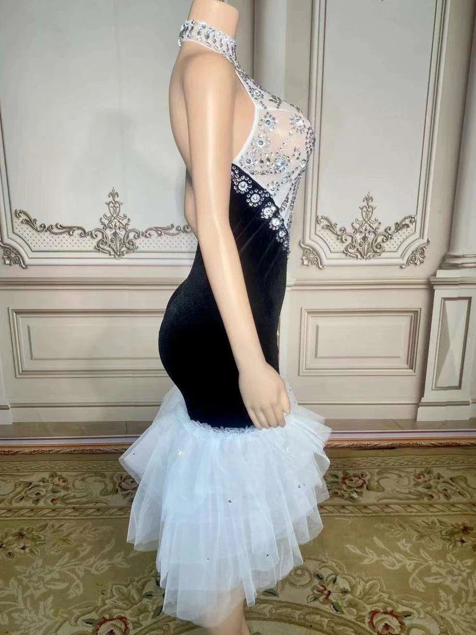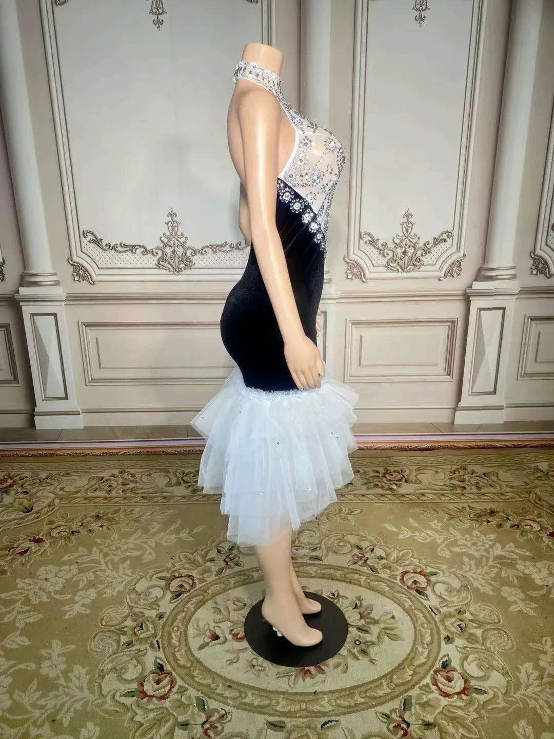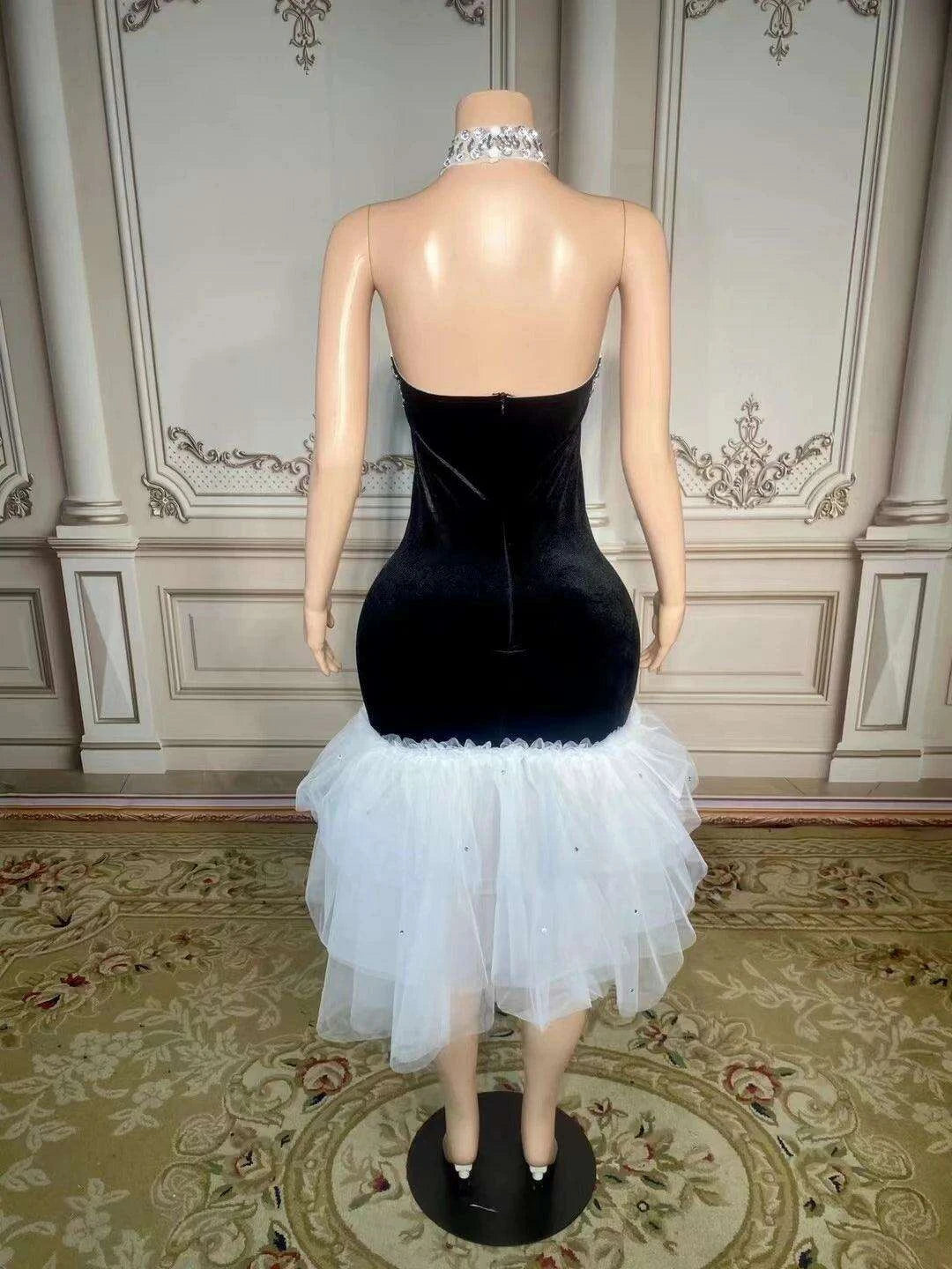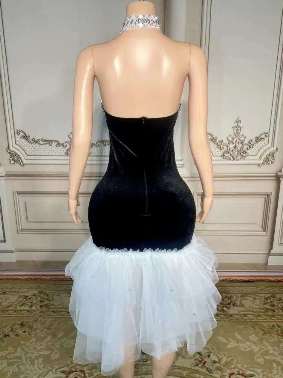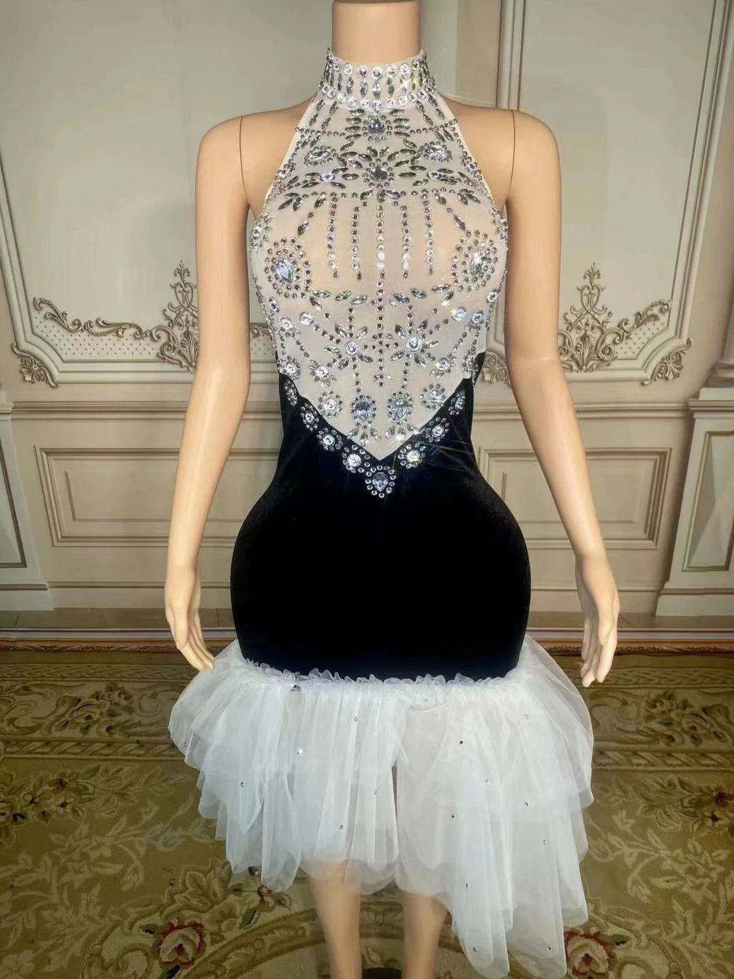 Elegant Black Velour Backless Halter Dress with Sparkling Crystal Details