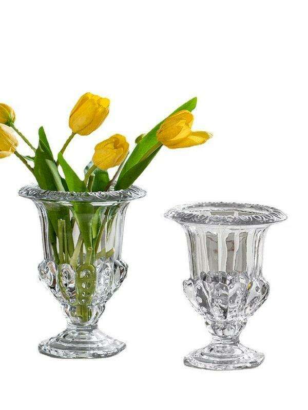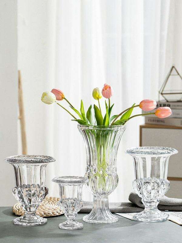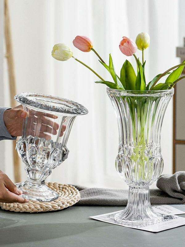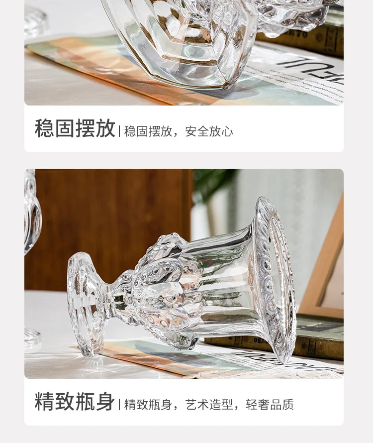 레트로 크리 에이 티브 라이트 럭셔리 바람 램프 높은 발 유리 꽃병 투명 크리스탈 꽃꽂이 로마 꽃병 장식