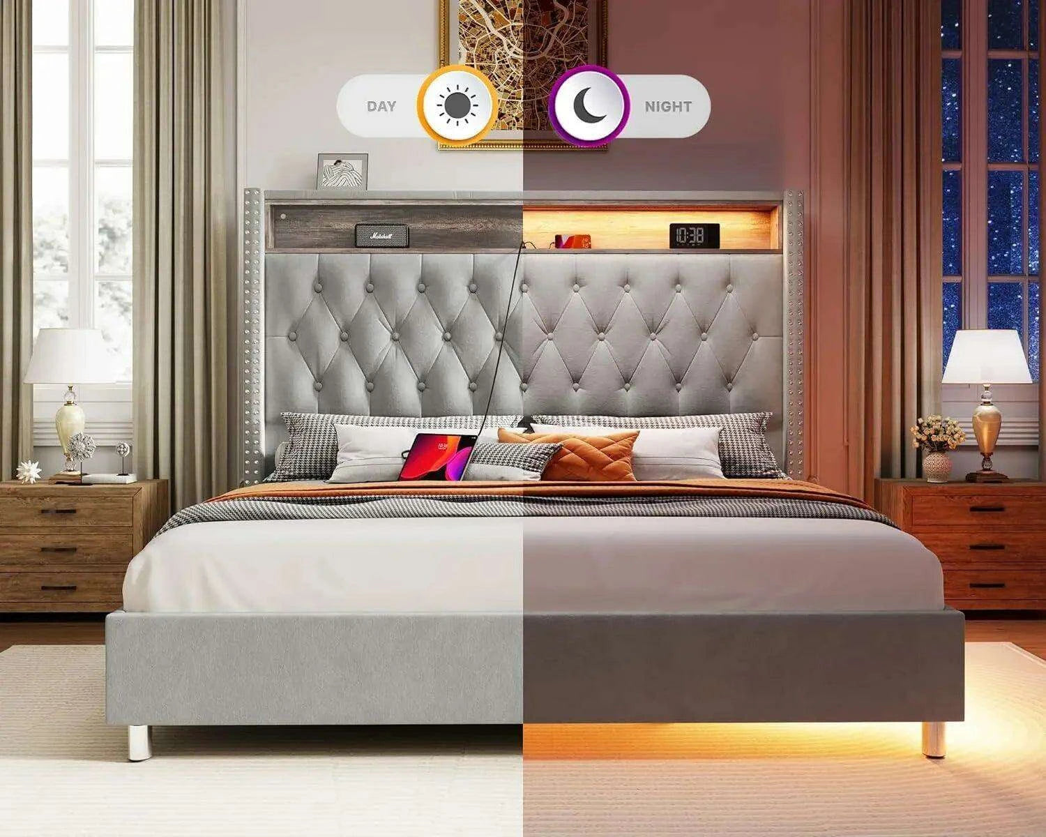 Elegant Dark Gray LED Queen Bed Frame with Charging Headboard & Ambient Nightlight..