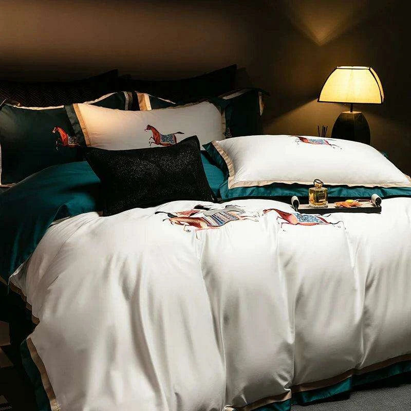 Elegant Galloping Horse Embroidered Egyptian Cotton Bedding Set in White and Orange - Complete Duvet Cover, Bed Sheet, and Pillowcase Collection- Très Elite- Très Elite