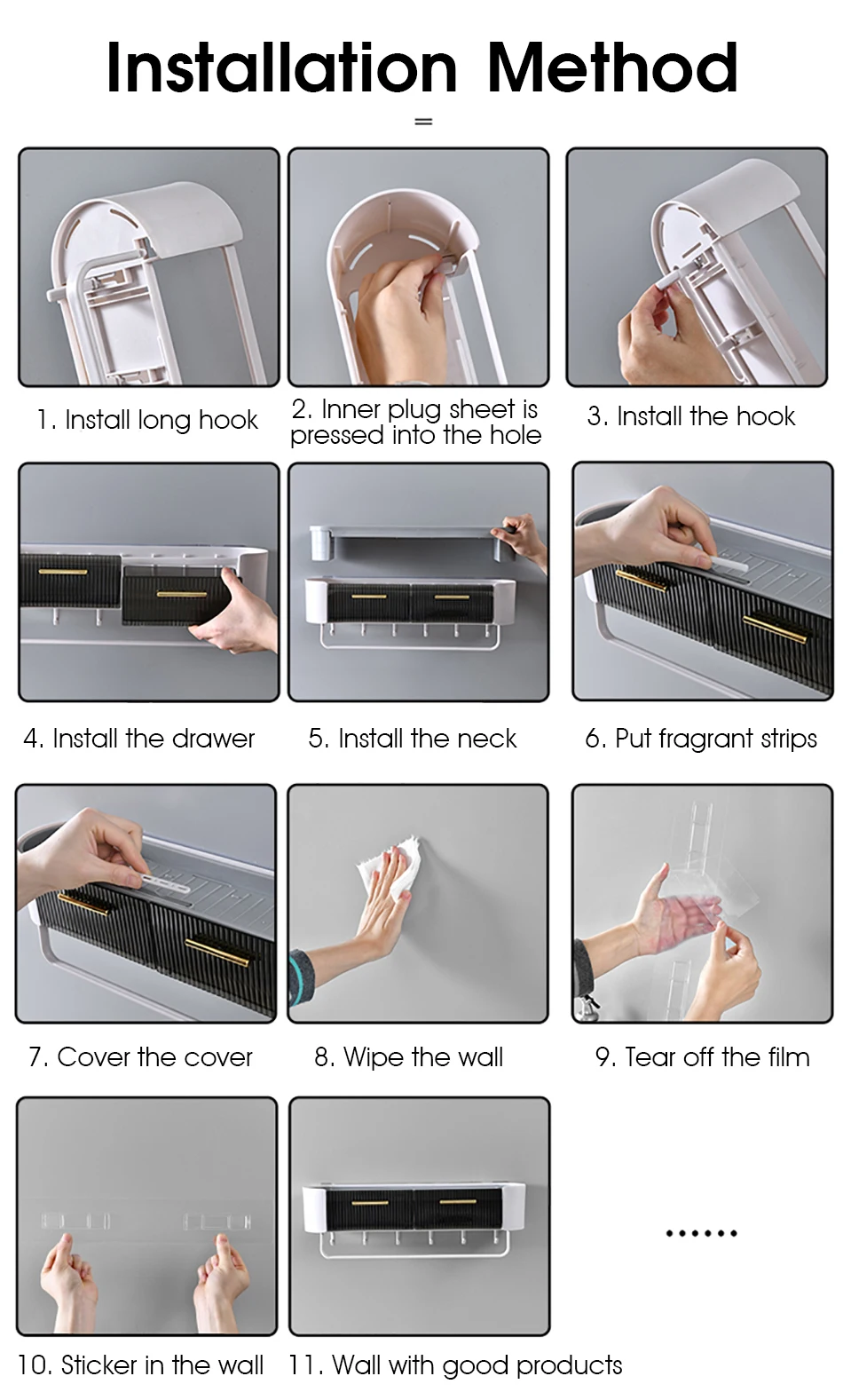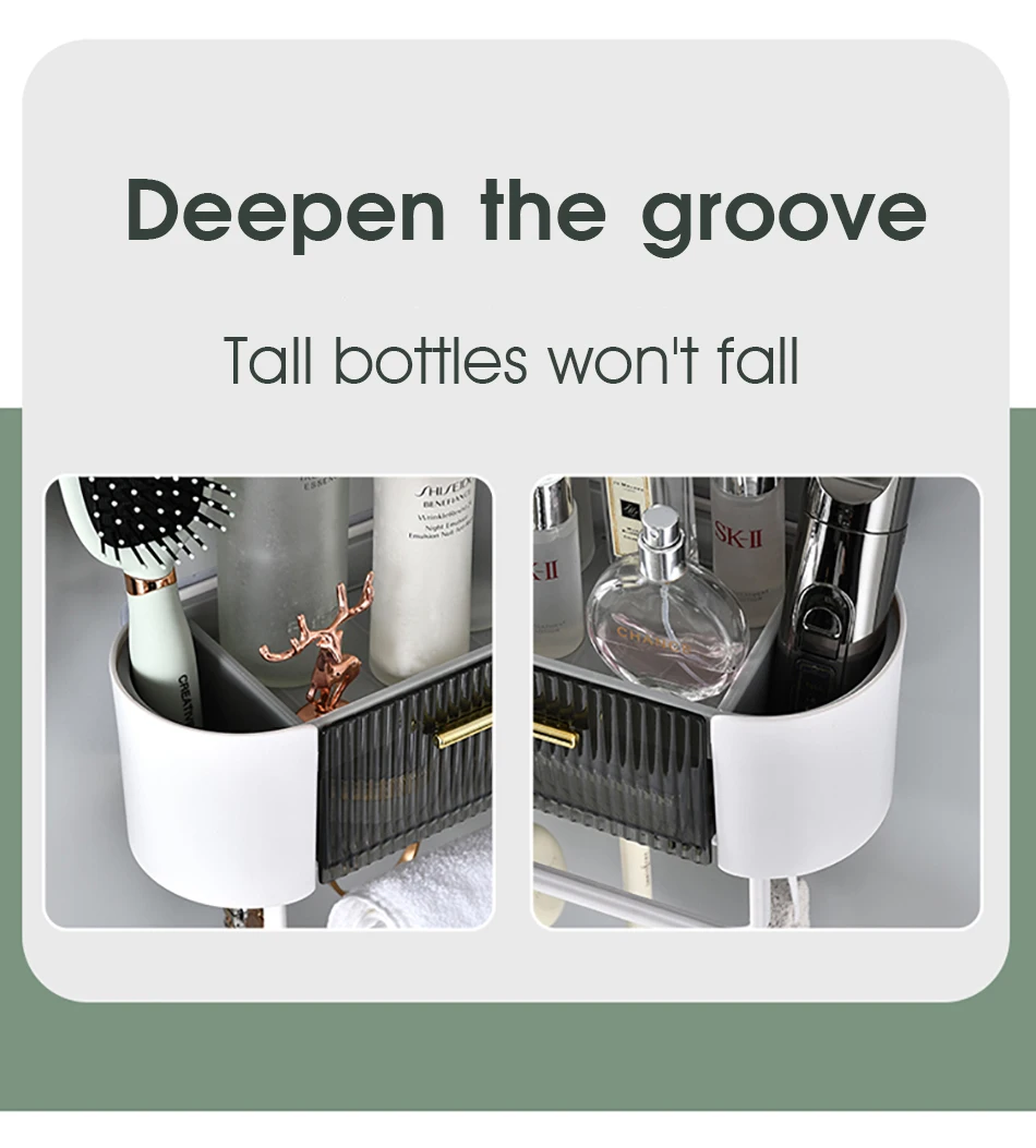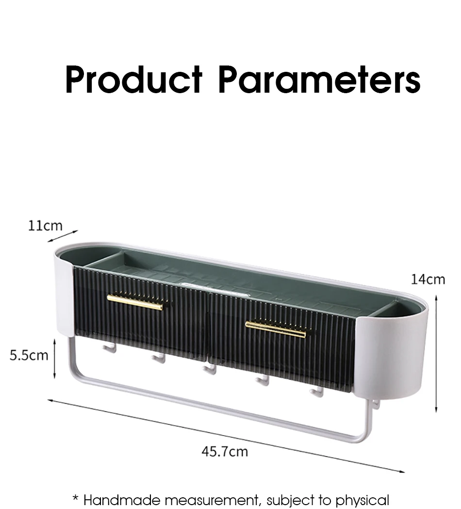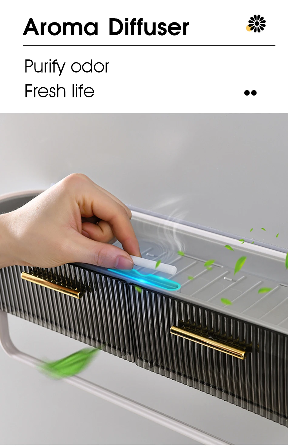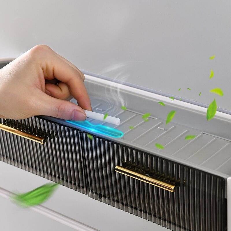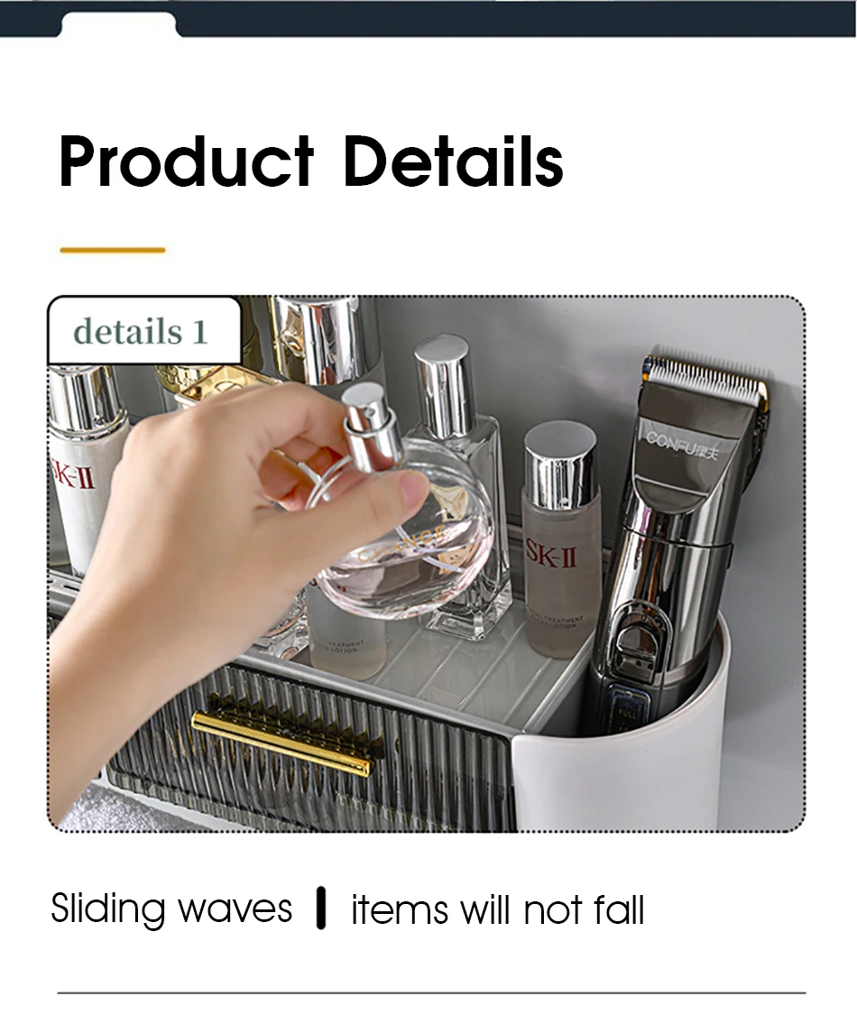 왼쪽 및 오른쪽 홈은 병을 건조하고 강화하도록 설계되었으며, 내장된 아로마테라피 홈은 공기를 정화하는 데 도움이 될 수 있습니다. 독립된 2단 서랍장으로 빠른 분류와 분류가 가능하여 필요한 것을 빠르게 찾을 수 있습니다.