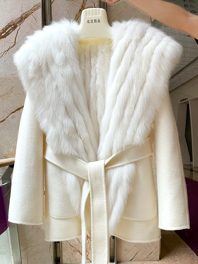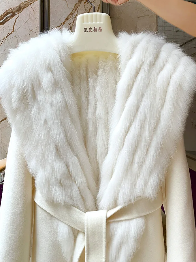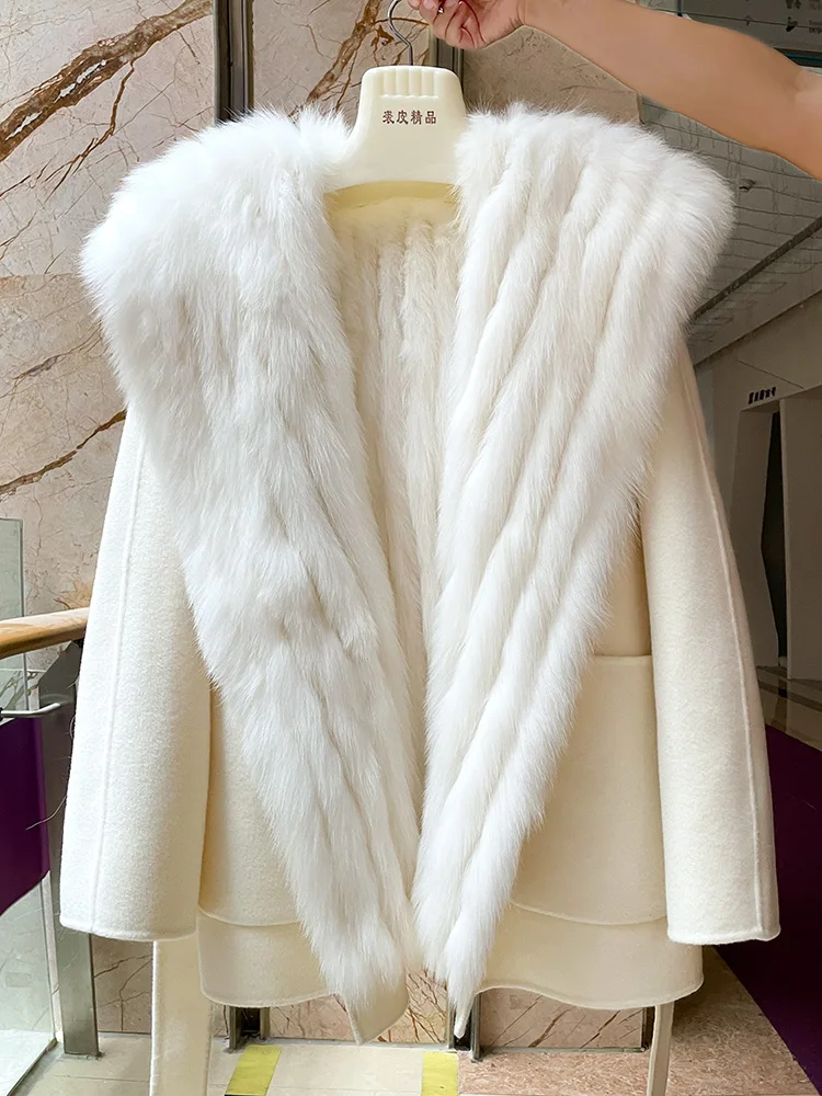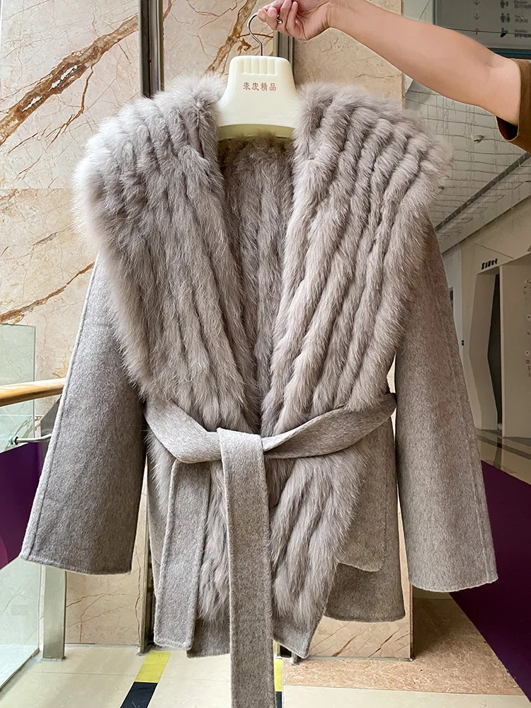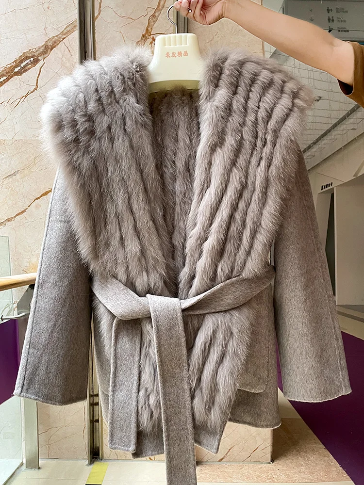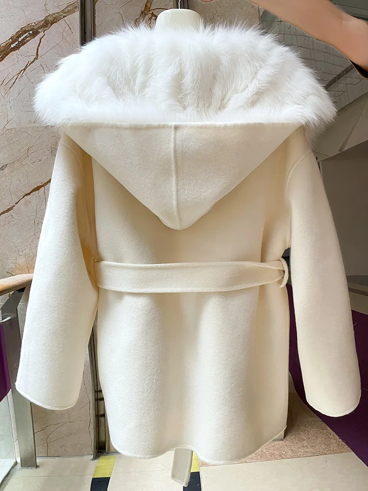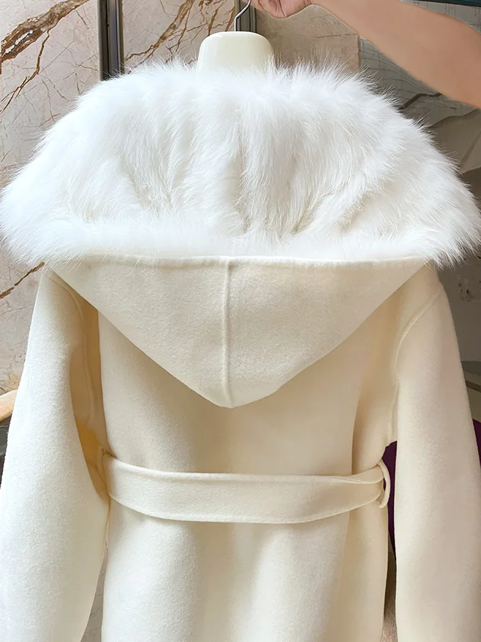 ZDFURS * 여우 모피 모피 코트 여성용 중간 길이 후드 양면 모직 제품 울 캐시미어 코트 3 웨어 파카 겨울