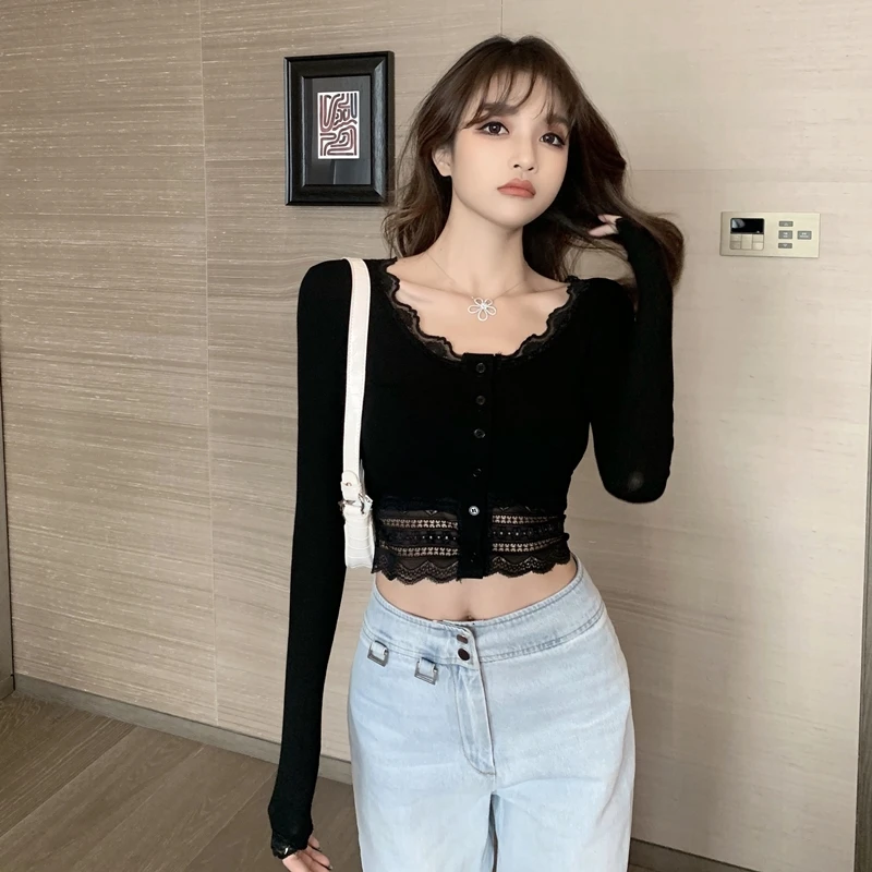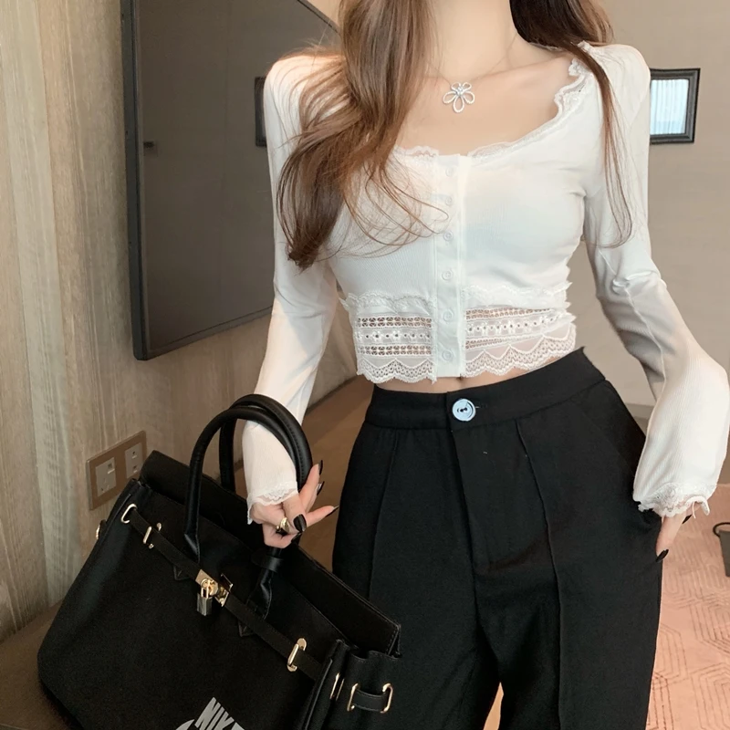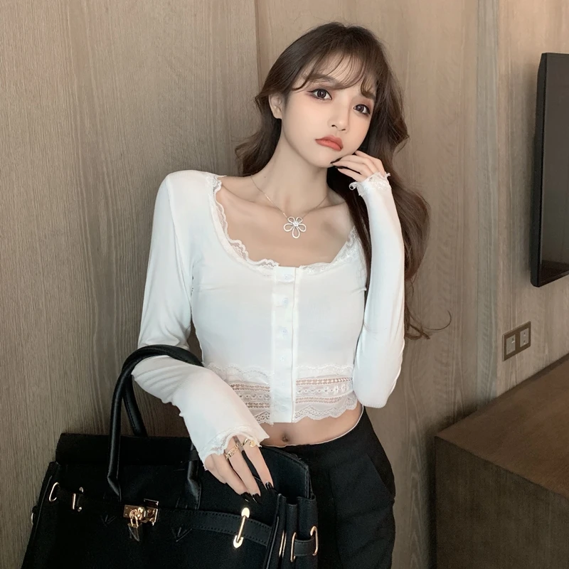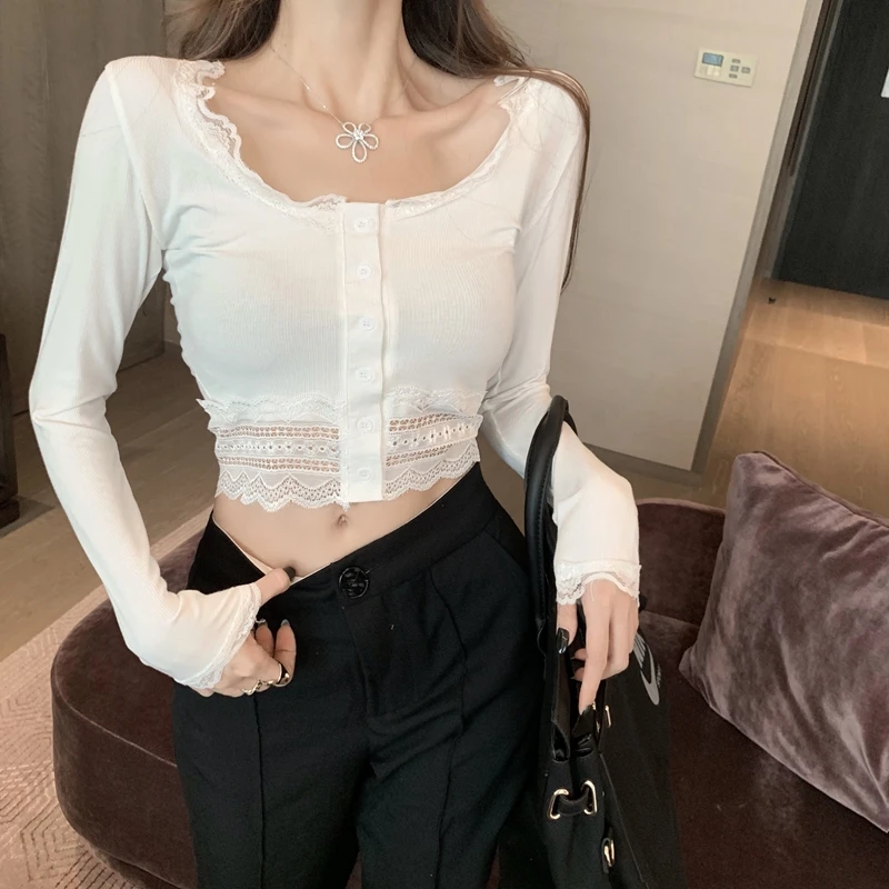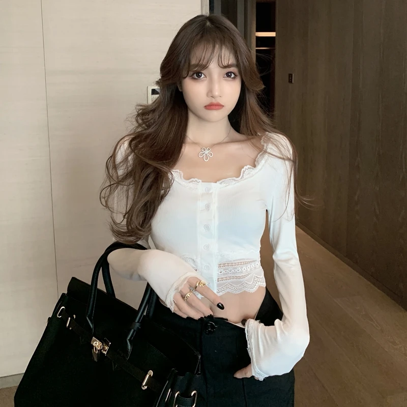 우아한 레이스 중공 가을 여성 T 셔츠 2021 솔리드 컬러 슬림 티 자르기 탑 여성 섹시한 O 넥 긴 소매 티셔츠 레이디 기본