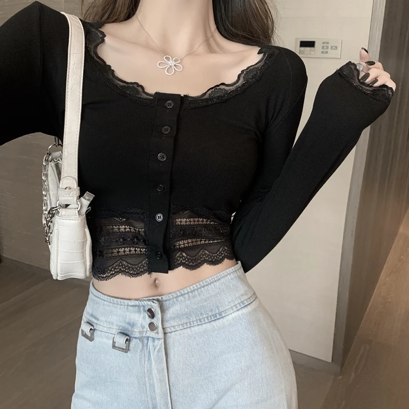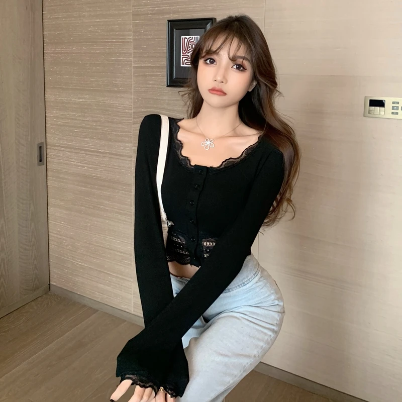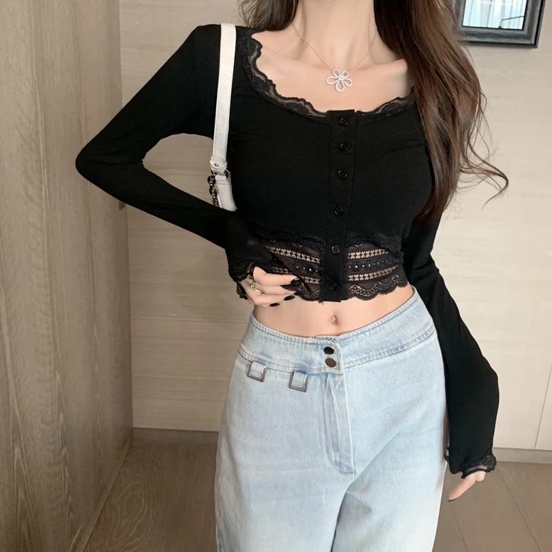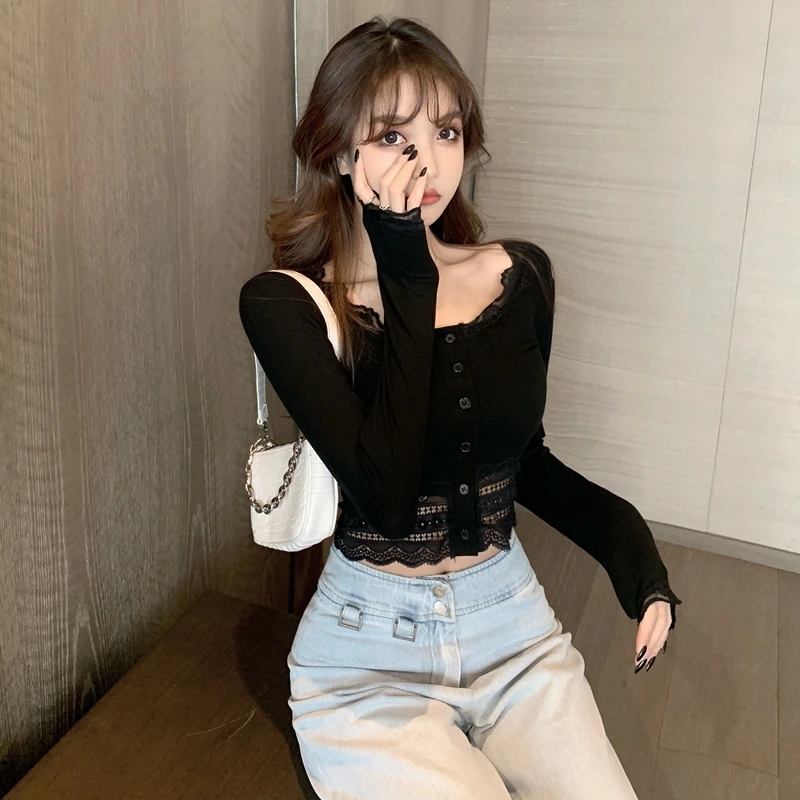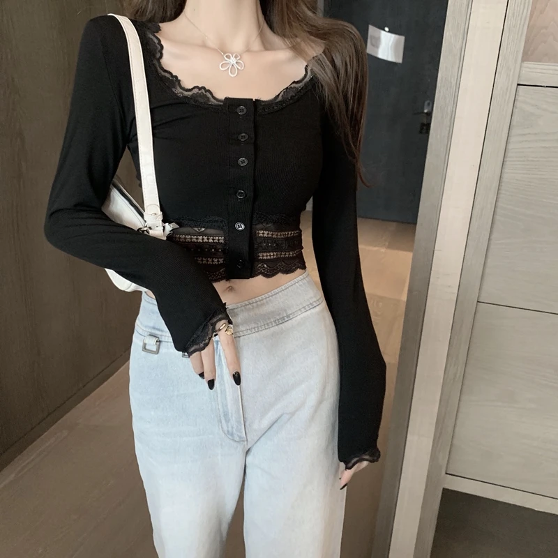 우아한 레이스 중공 가을 여성 T 셔츠 2021 솔리드 컬러 슬림 티 자르기 탑 여성 섹시한 O 넥 긴 소매 티셔츠 레이디 기본