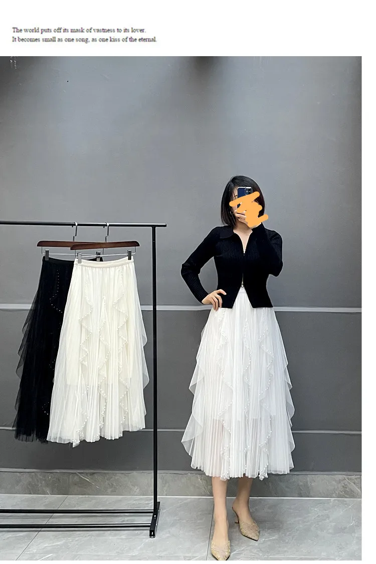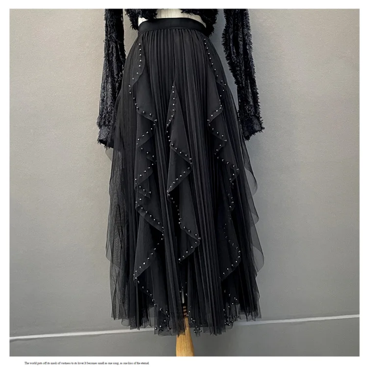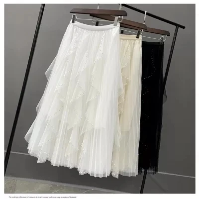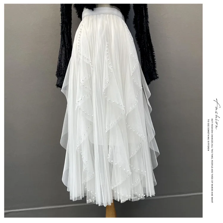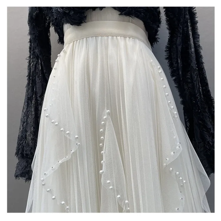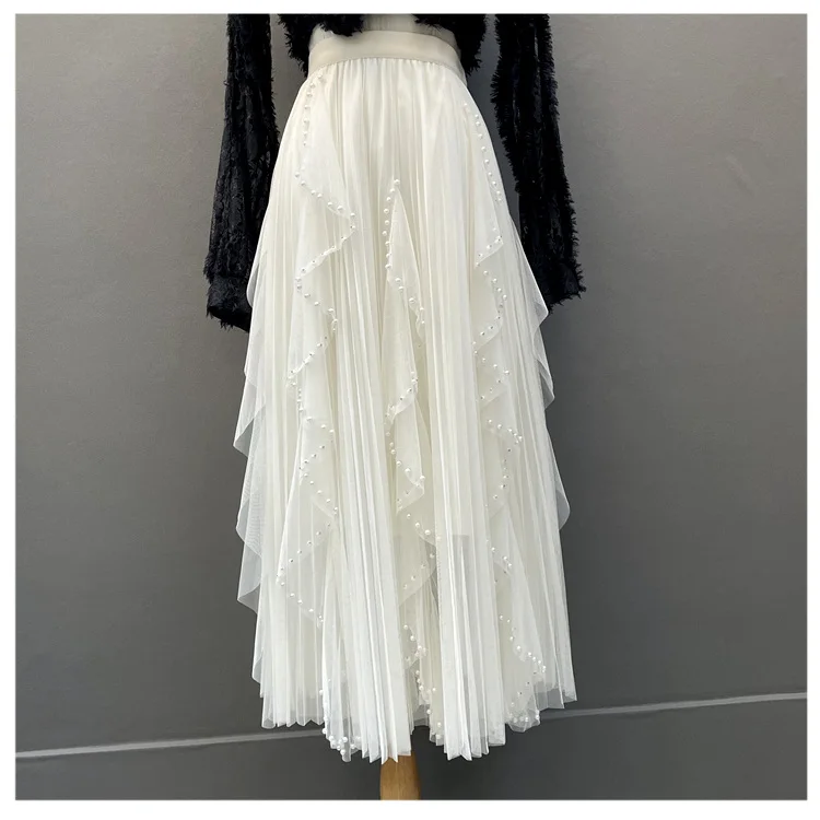 진주 구슬 불규칙한 주름 메쉬 Tulle 치마 여성 캐주얼 한국어 패션 탄성 높은 허리 Splicing 긴 파티 투투 스커트