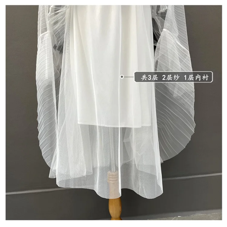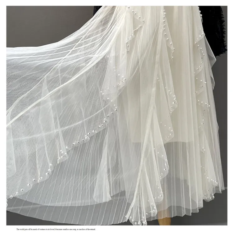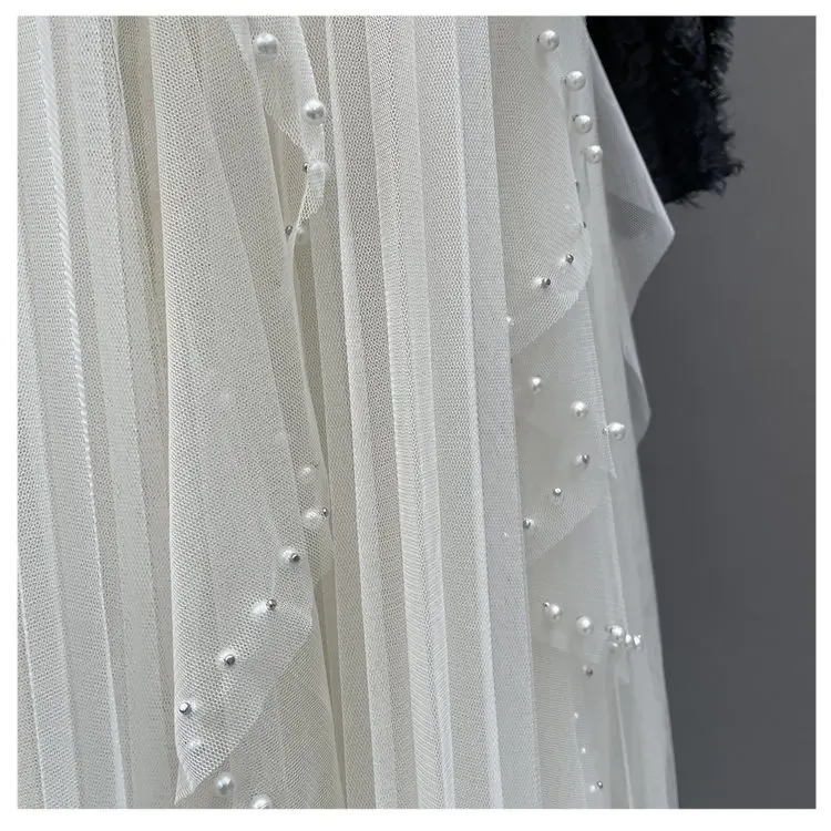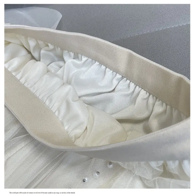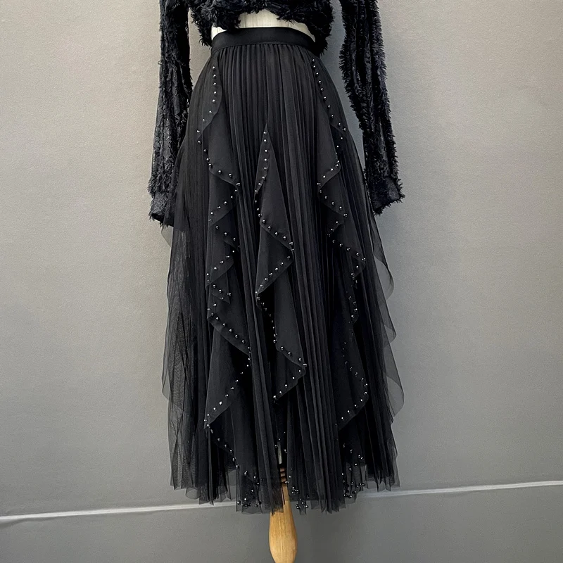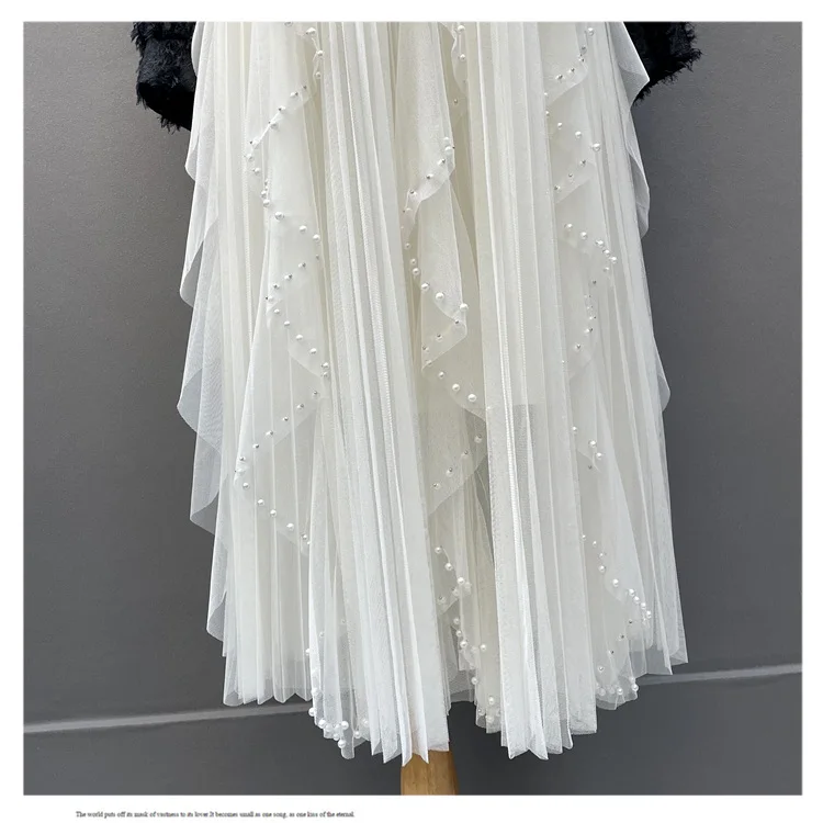 진주 구슬 불규칙한 주름 메쉬 Tulle 치마 여성 캐주얼 한국어 패션 탄성 높은 허리 Splicing 긴 파티 투투 스커트