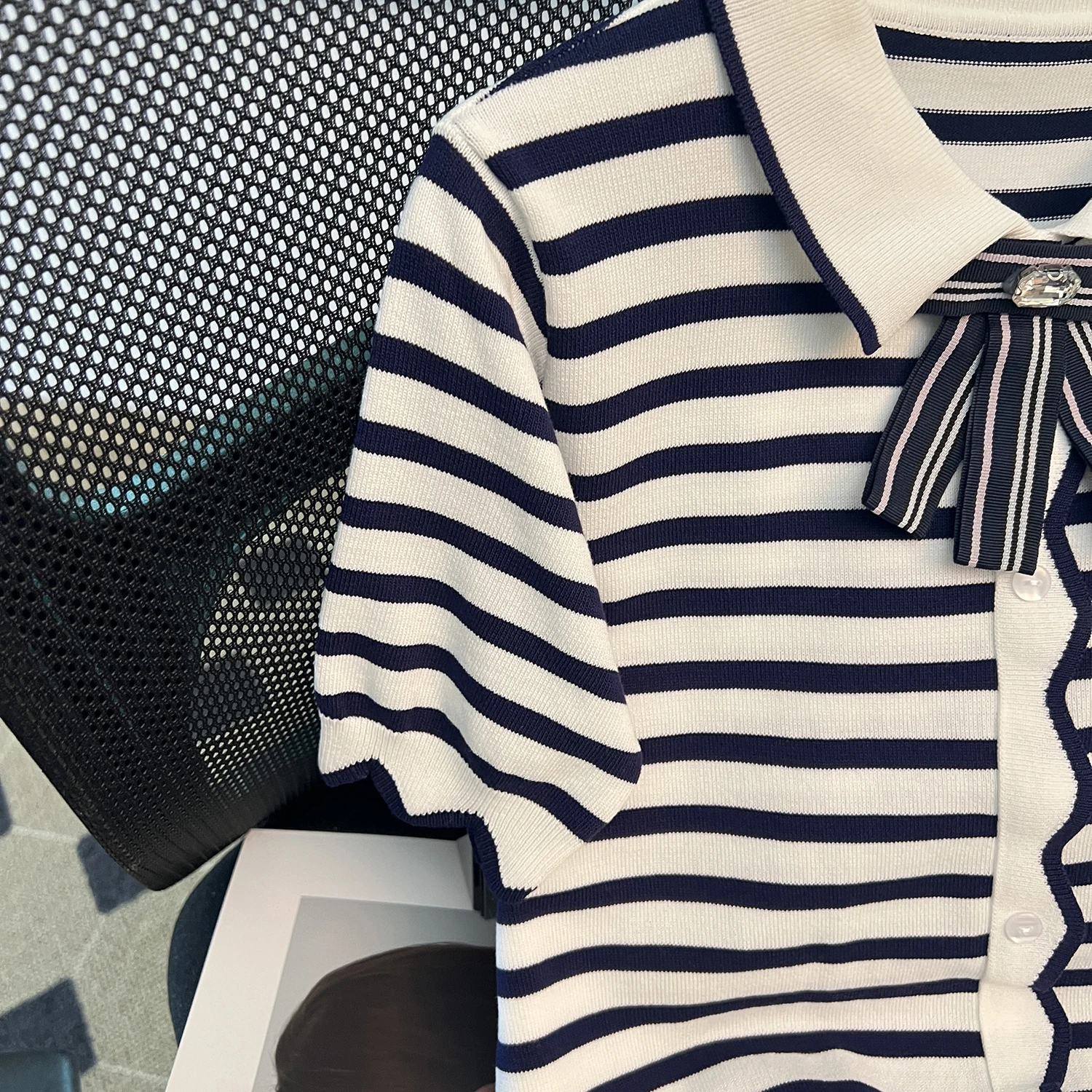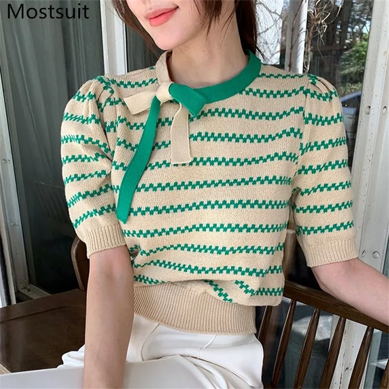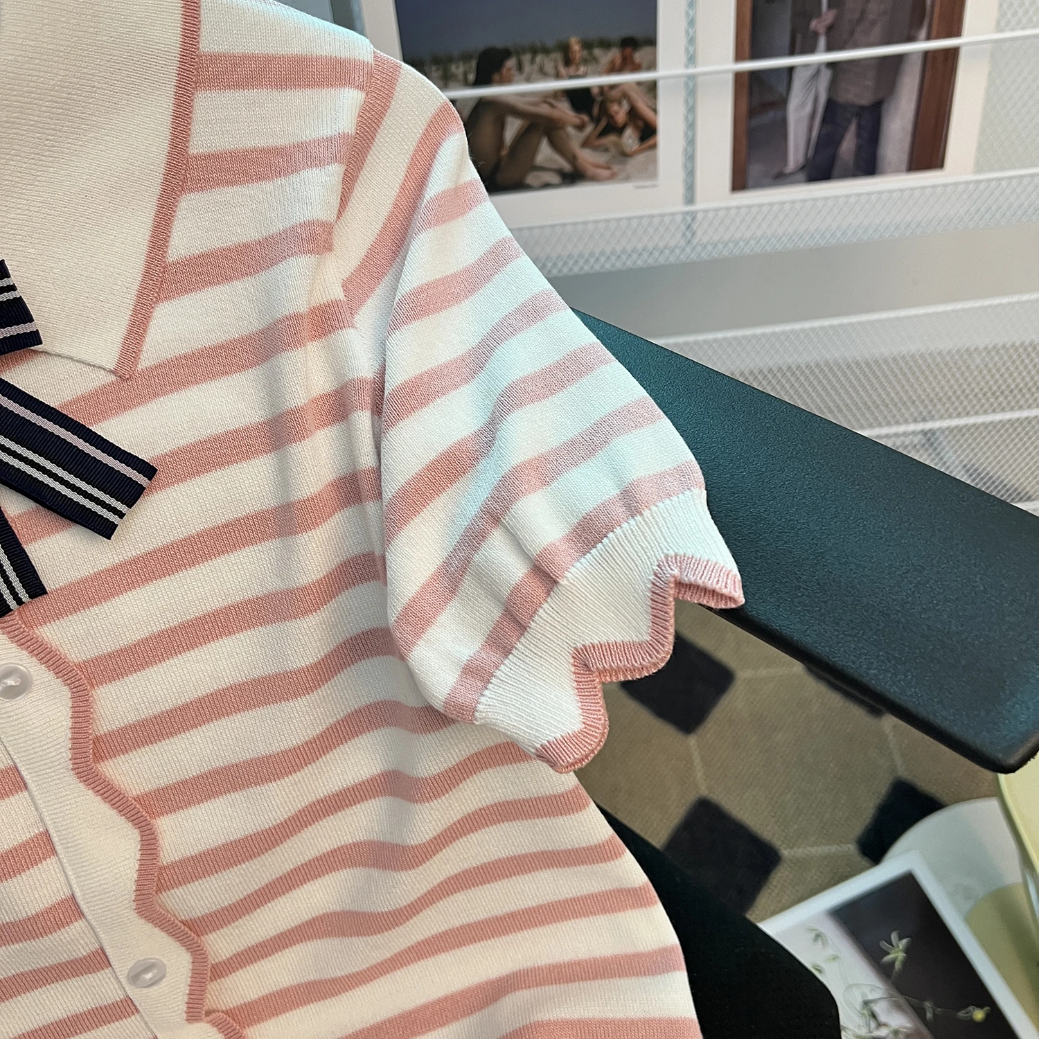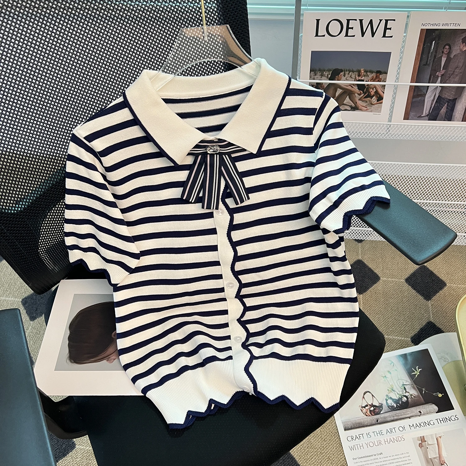 여름 스트라이프 니트 여성 풀오버 아이스 실크 Bowtie 얇은 니트 스웨터 패션 반팔 턴 다운 칼라 니트 탑스
