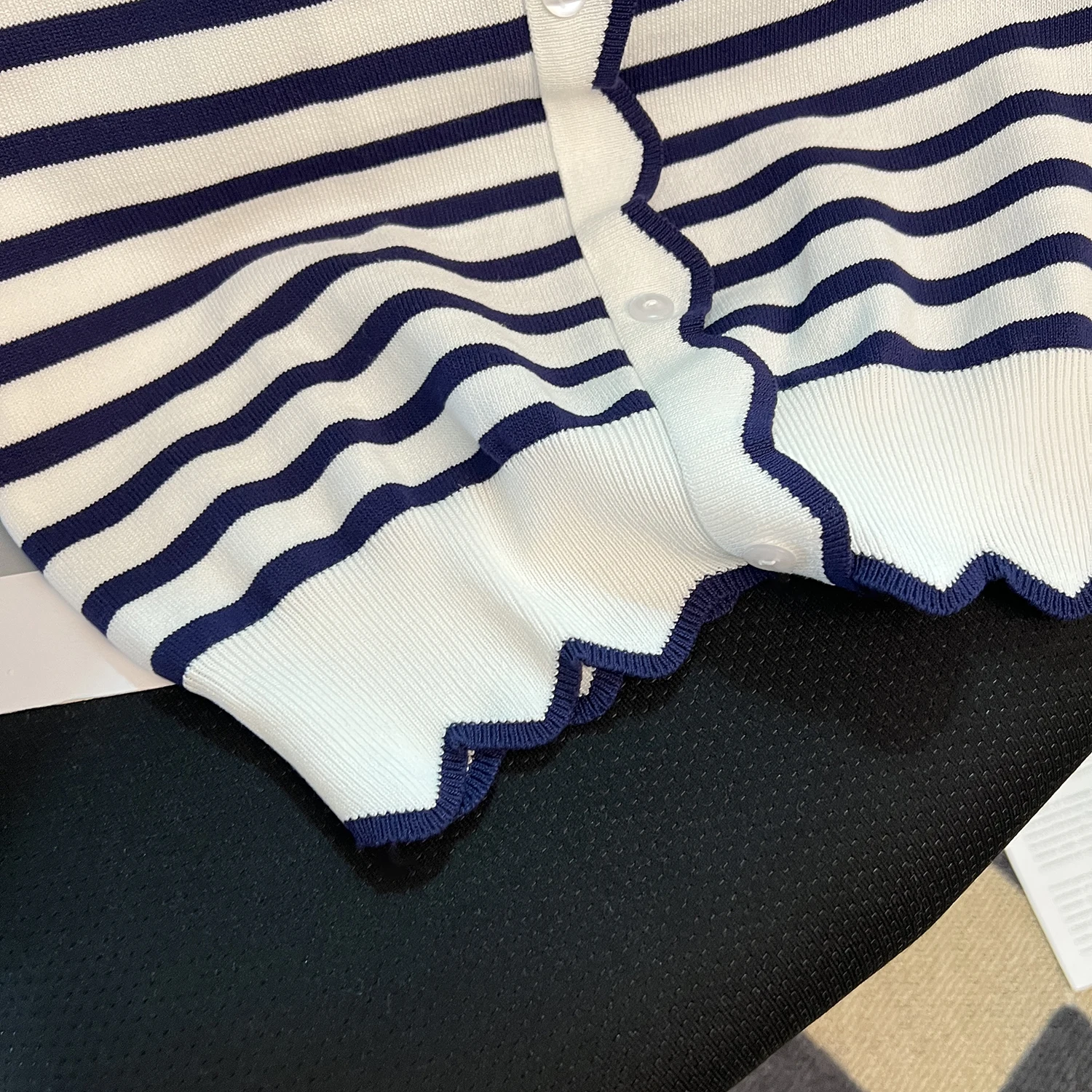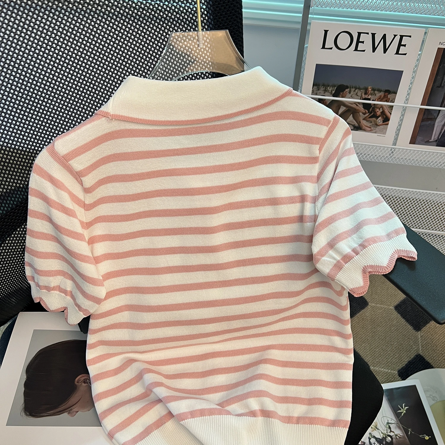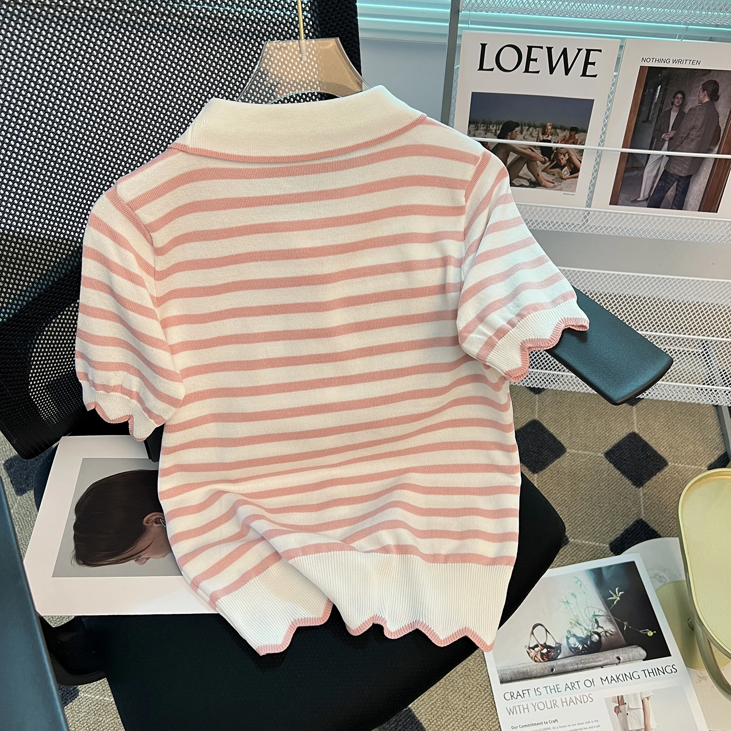 여름 스트라이프 니트 여성 풀오버 아이스 실크 Bowtie 얇은 니트 스웨터 패션 반팔 턴 다운 칼라 니트 탑스