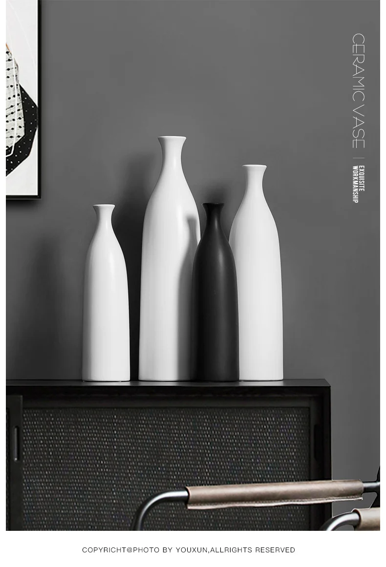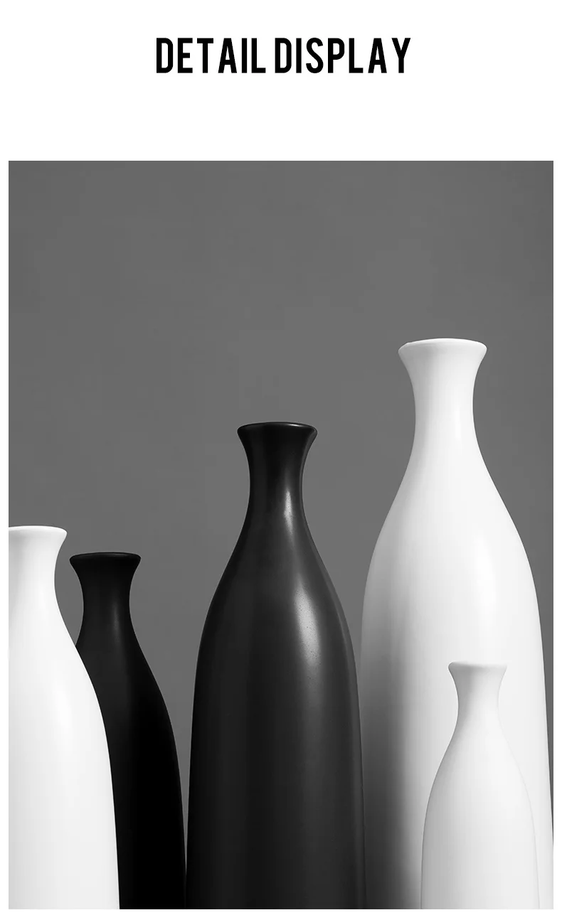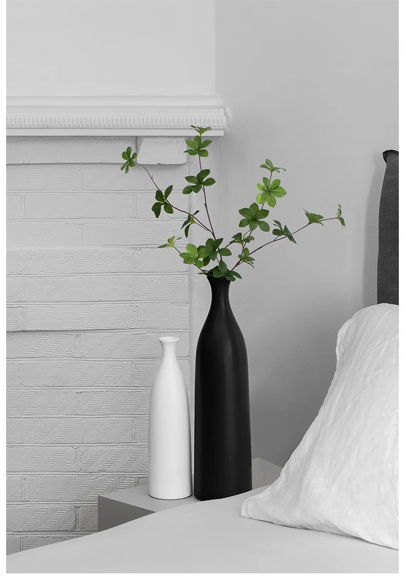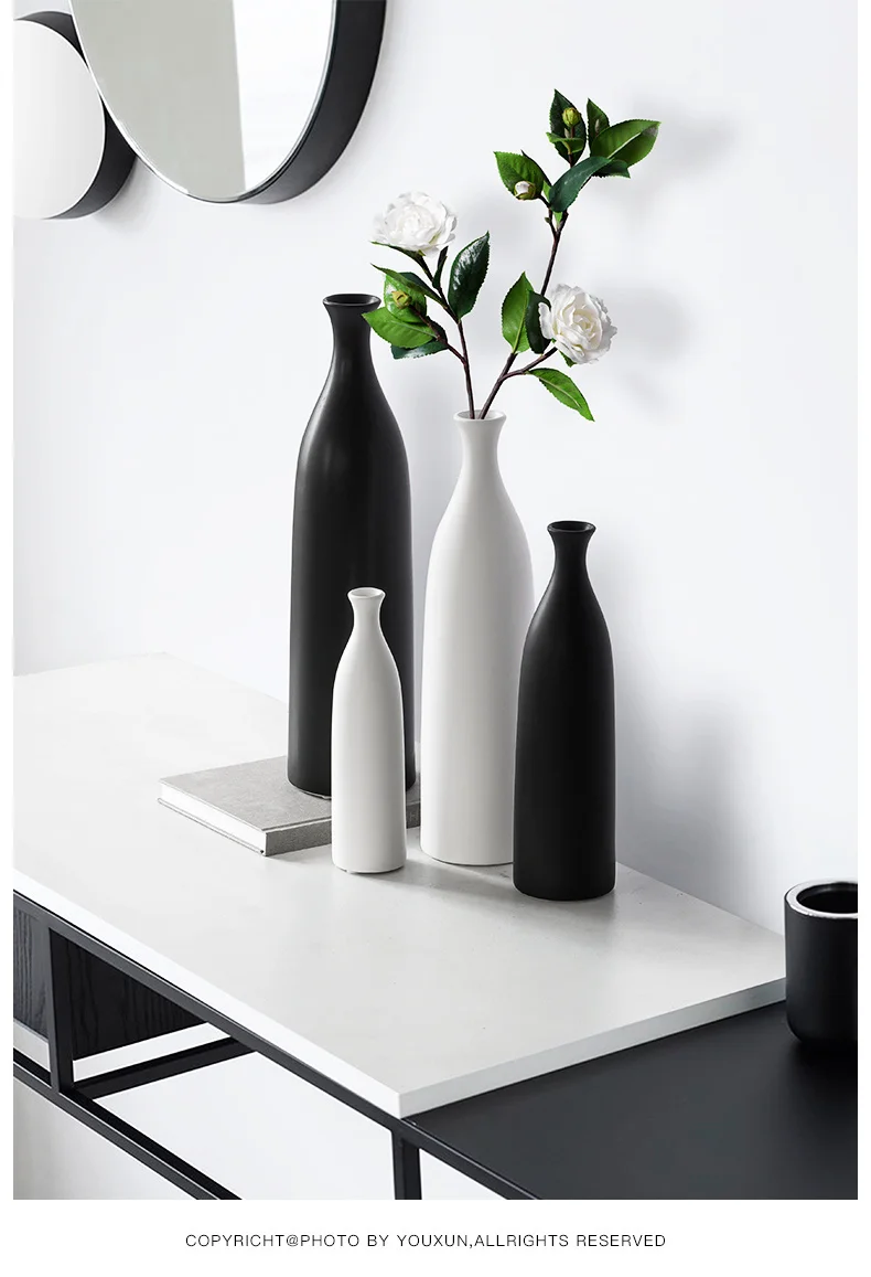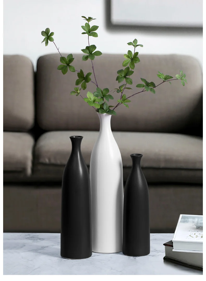 긴 목과 얇은 입 꽃꽂이 병이 있는 검은색 세라믹 꽃병