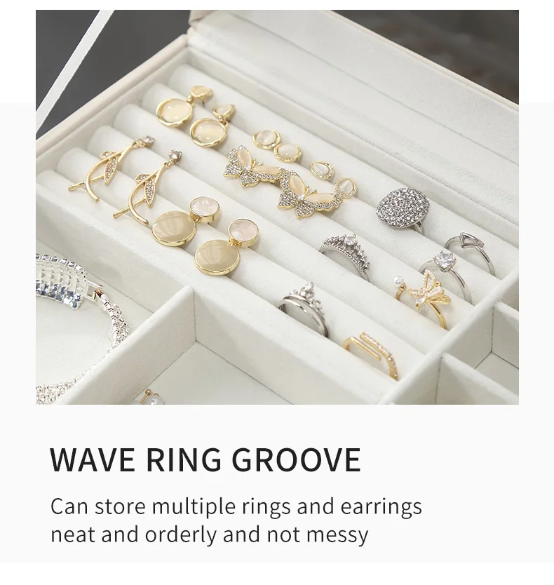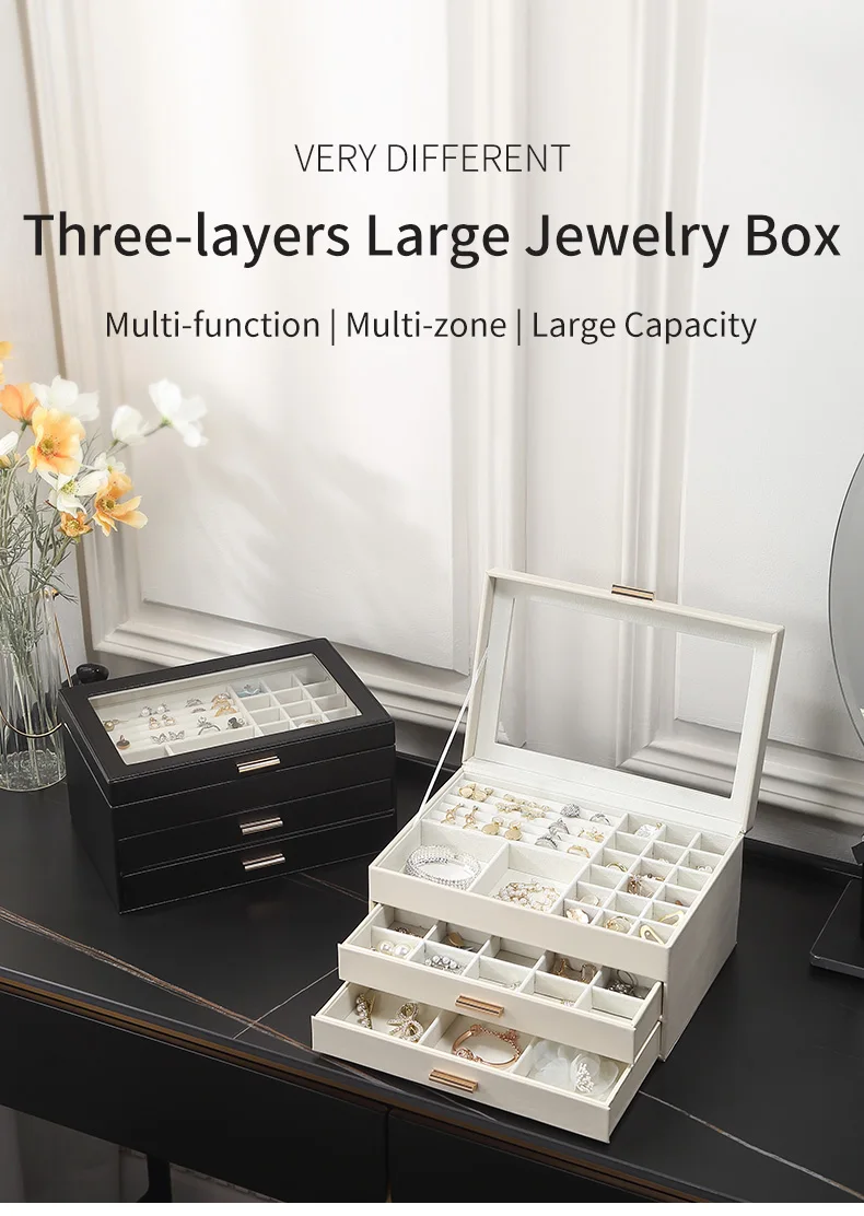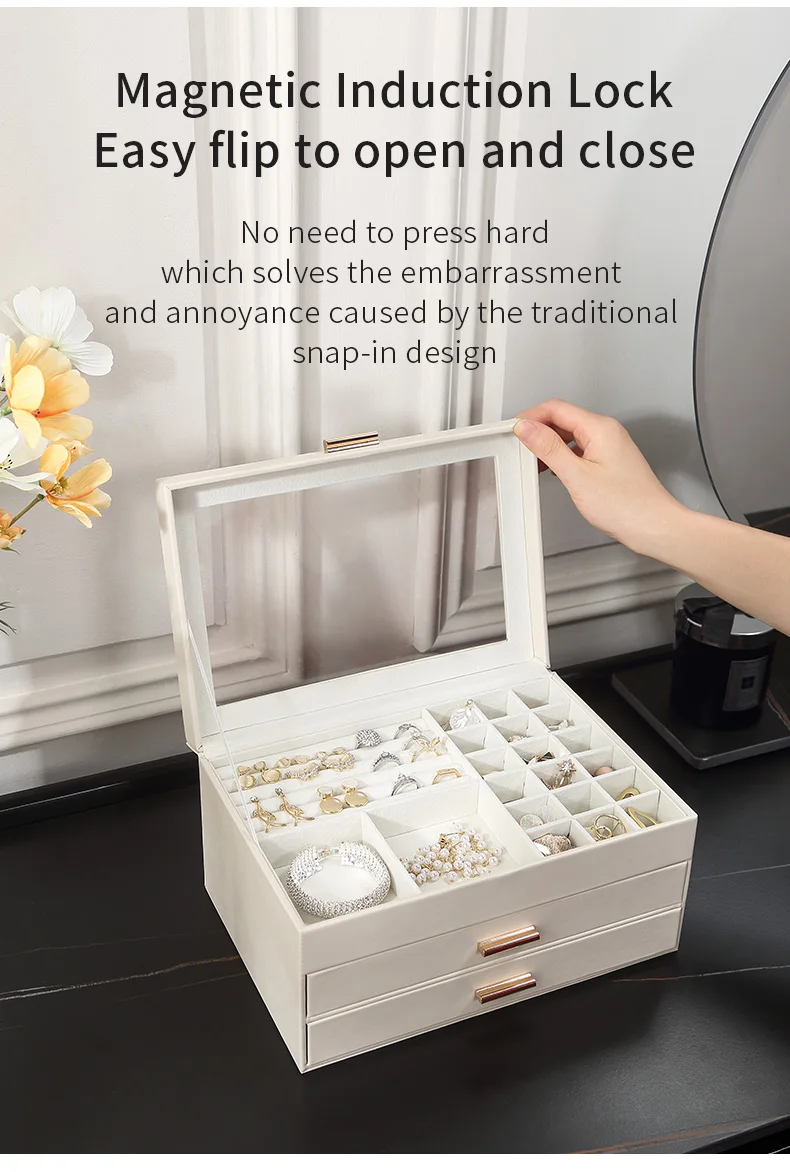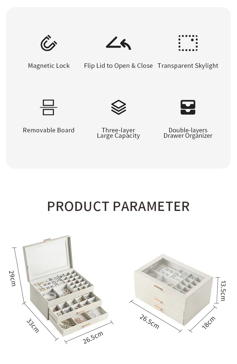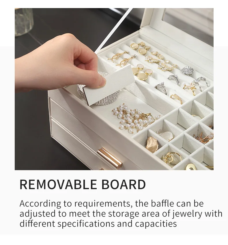 - 3중 보석 정리함: 다양한 레이아웃과 용량으로 반지, 귀걸이, 목걸이, 귀중품 등 다양한 크기의 보석을 보관할 수 있습니다.
